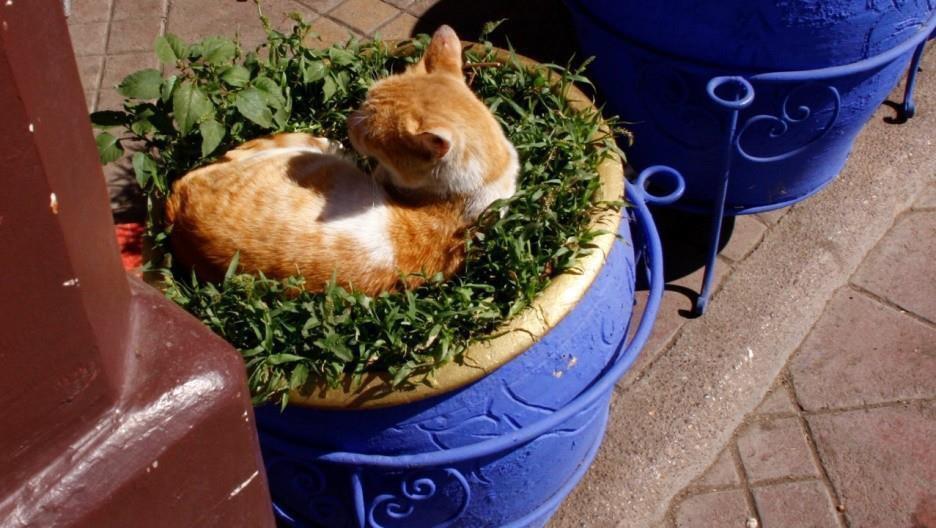 We learned Mohammed approved of cats living in homes. In the Koran. He is to have said that angels often visit houses where cats dwell. So cats are honored in these Islamic countries. Since they are “on the streets” so much of the time, the cats have interbred so much that there is a “typical” cat: a very colorful calico coat, narrow face and very long and somewhat bushy tails. There are other color patterns, but orange patches with black stripes intermixed with much white is the most consistent look.