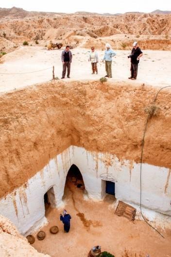 She walked us to a square hole in the earth, about 25 ft. x 25 ft. square and about 75 ft. deep. There was an open courtyard with a lone green bush at its center and to one side an elderly lady sitting near one wall. Draping over the walls down towards the courtyard were two flimsy and worn ropes, but they didn't look like any “elevator” we wished to try. Smiling, Halema led us away from the hole in the ground around towards some twenty steps leading down and around a small hill. At the bottom of the hill we saw an archway surrounded by some wooden framing decorations. Through that arch, we entered the troglodyte home.