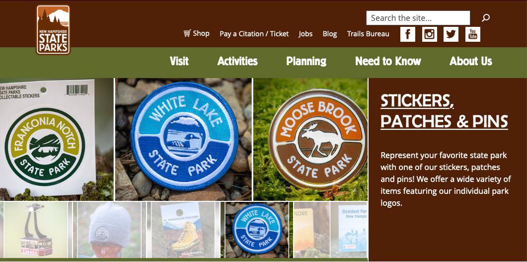 New Hampshire State Parks offers one of the most extensive parks merchandise collections. Their online and in-store gift shops sell books and maps about different parks; patches, pins, and magnets; branded hiking poles; shirts; and other souvenirs. Their physical stores also give visitors the opportunity to order memorial benches and New Hampshire State Park Licence Plates, which include access to all parks with the $85 annual licence plate fee.