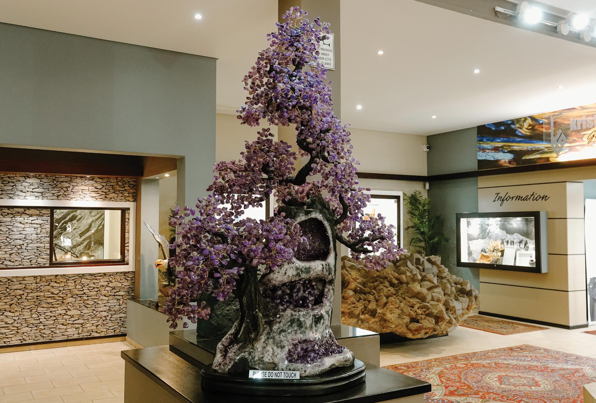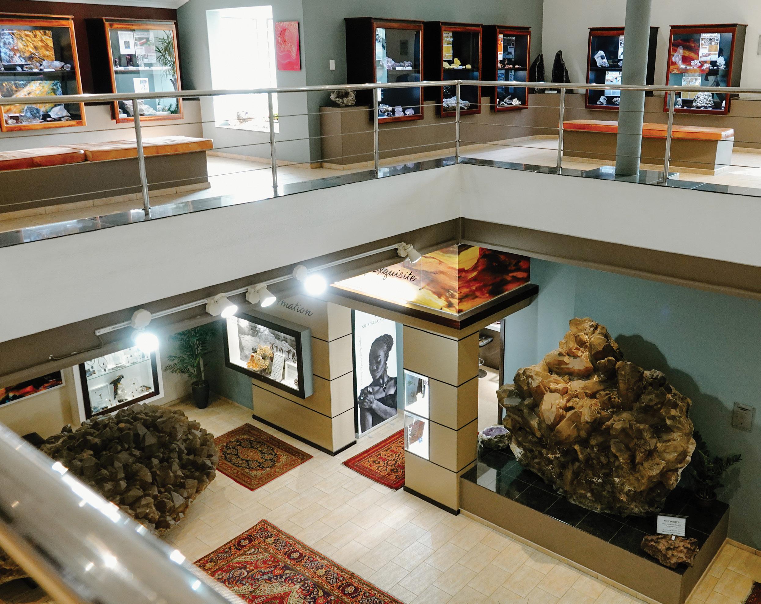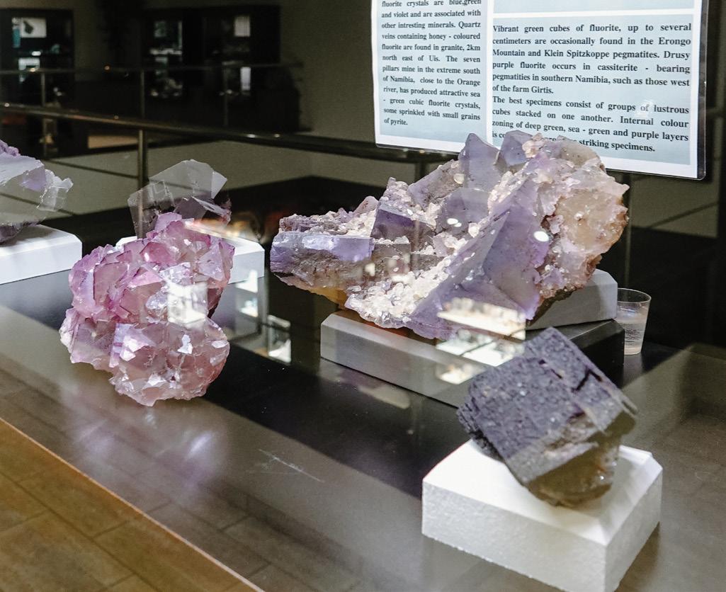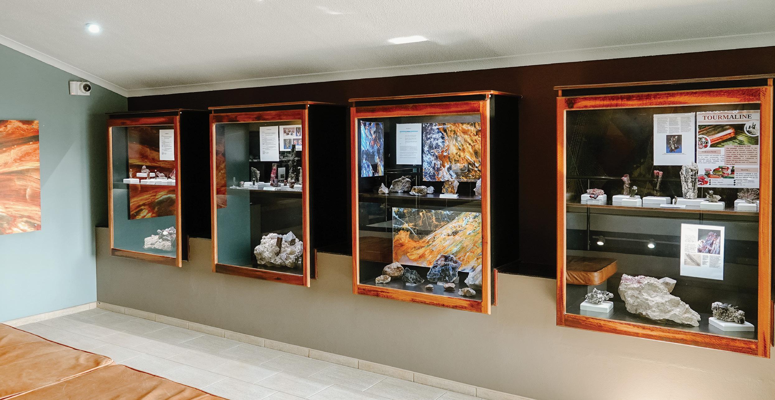its impressive displays, the exhibition now features three jewellery boutiques, a souvenir shop, a ‘gem garden’, a rock cave, and a studio. Here, visitors can watch local artists tinker away on semi-precious stones. The displays include Dioptase; shades of blue, pink, and purple Tourmaline; Pyrite; Amethyst; Fluorite clusters; Aquamarine; and Pietersite. Notably, Pietersite is found in only two places in the world: China and Namibia.