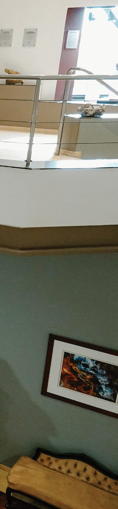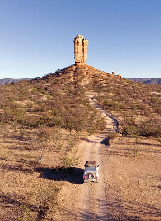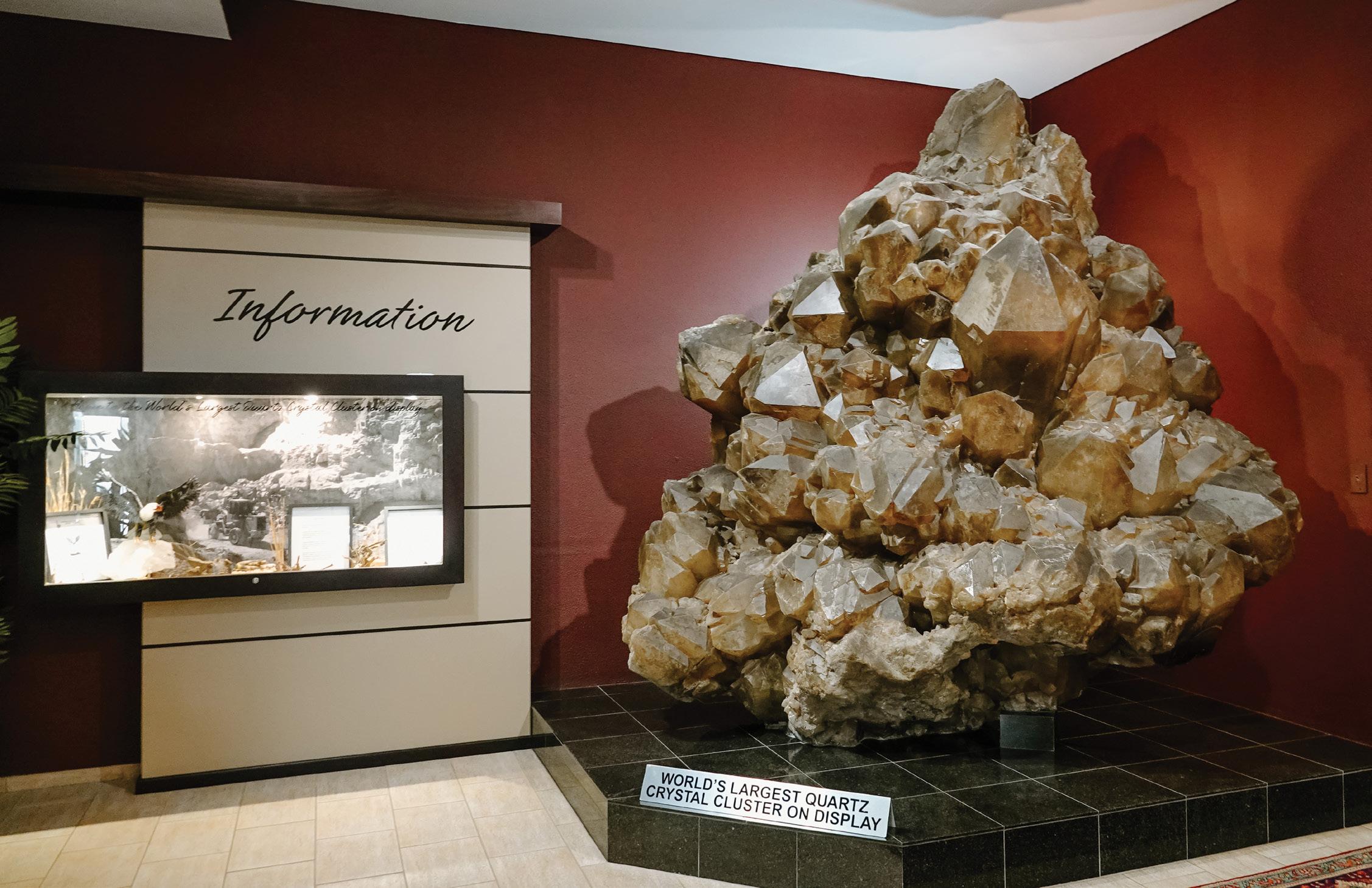 Quartz crystals found at the Otjua mine near Karibib are distinct for their seemingly nearperfect beauty. Many are also unique, as they are doubly terminated, a term meaning the crystals have natural points at both ends instead of just one. This quality also makes them “floaters”: crystals that formed while suspended in mineralised fluid, not attached to any surface. There is no recorded reference to the largest floater ever found. It is possible that the Otjua crystals hold that distinction. The largest single crystal from Otjua is a floater measuring 2.2 metres long and 1.8 metres in circumference, with an estimated weight of one ton. It is part