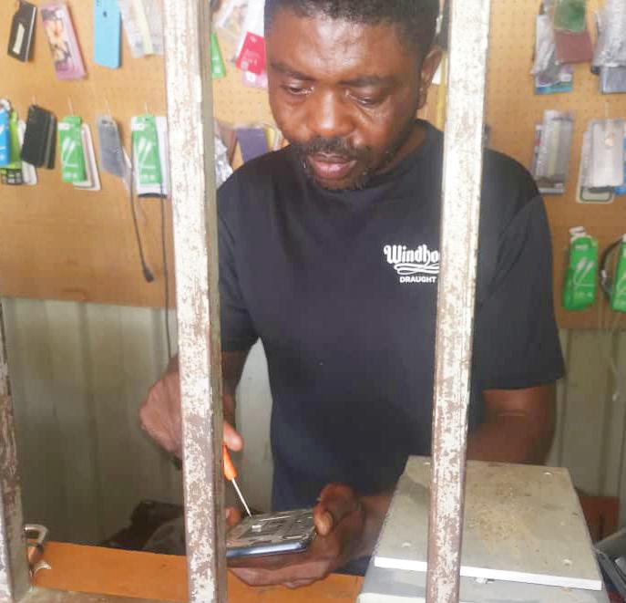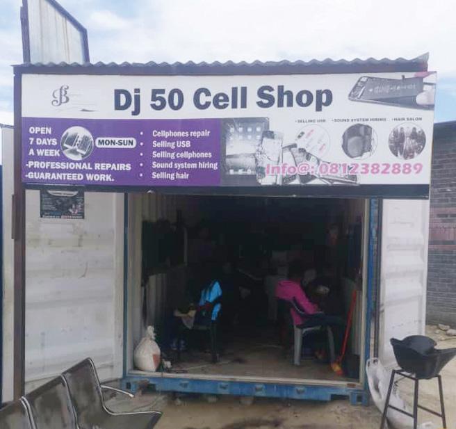 Shitaleni has a container along Ondangwa’s main road. Here, he repairs cellphones and computers, while selling merchandise such as cellphone accessories and hair products. It is also here where he cuts clients’ hair.