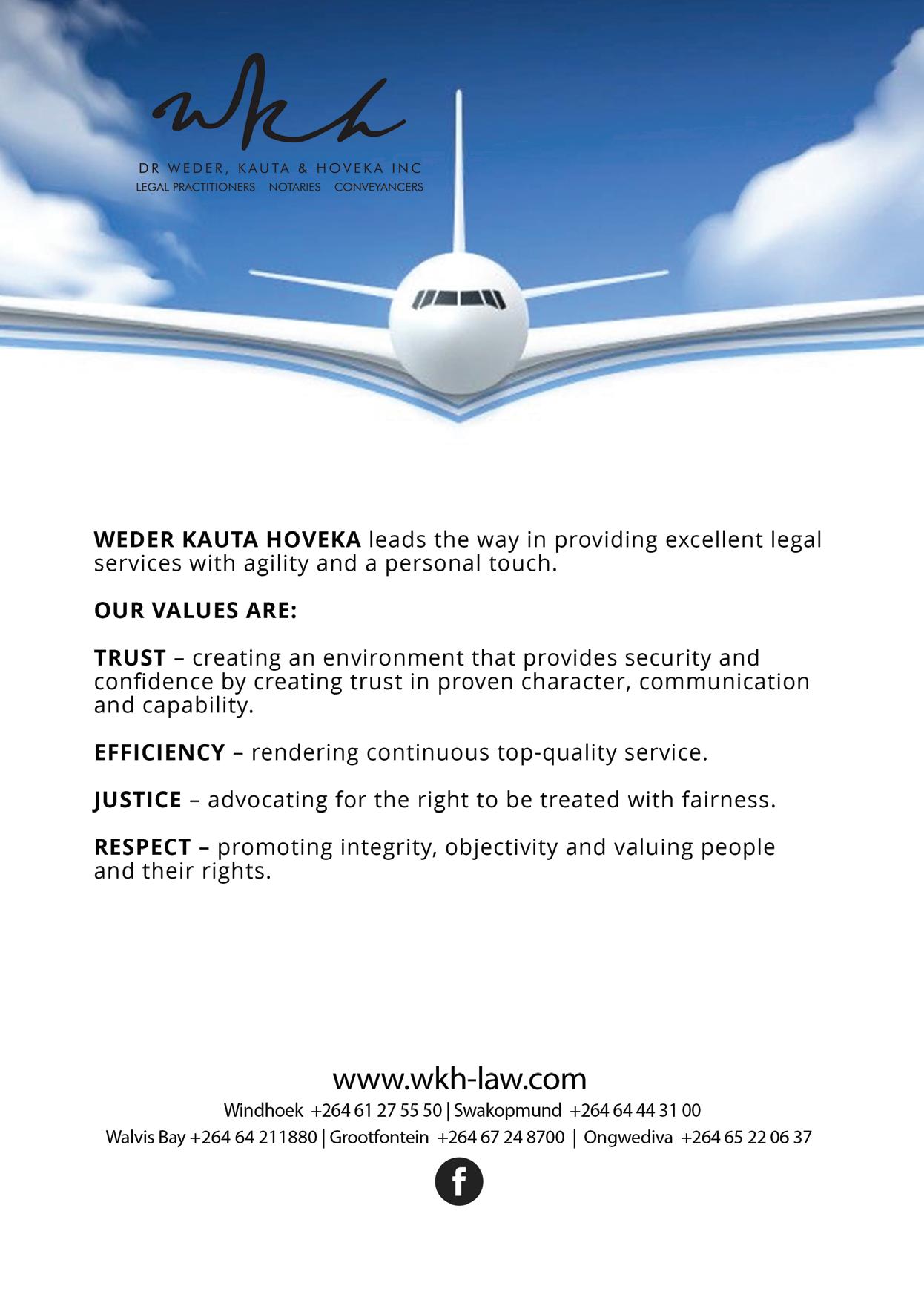FlyNamibia currently operates domestic routes from Eros Airport in Windhoek to Ondangwa, Rundu, Katima Mulilo, Walvis Bay and Oranjemund, as well as a regional route between Hosea Kutako International Airport and Cape Town International. Flights can be booked through all major travel agencies, or directly via FlyNamibia’s 24/7 contact centre at +264 83 339 0011. Customers can also visit www. flynamibia.com.na for online bookings.