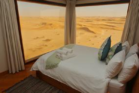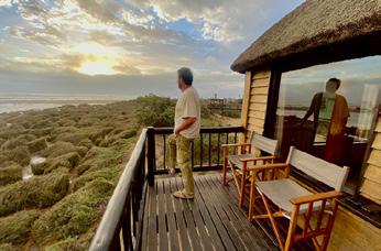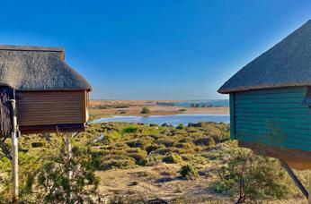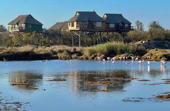 Above sand and tamarisk bushes bordering the Swakop River, nine wooden bungalows and two luxury villas stand on stilts with interlinked wooden walkways. The tamarisk merges into phragmites reeds, beach and sea, and in the distance the sensuous sand dunes of the Namib Desert lie seductively along the road to Walvis Bay and the west.