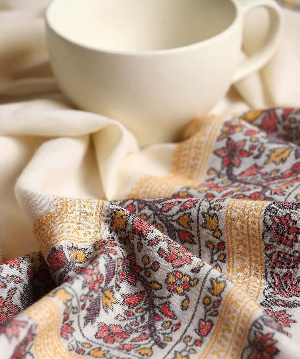 Fittingly, Air India’s beloved Maharaja mascot appears, but most notable is the delicate woven border. Its jacquard and motif echo the style of traditional Sozni embroidery from Jammu and Kashmir, often used to adorn pashmina shawls.