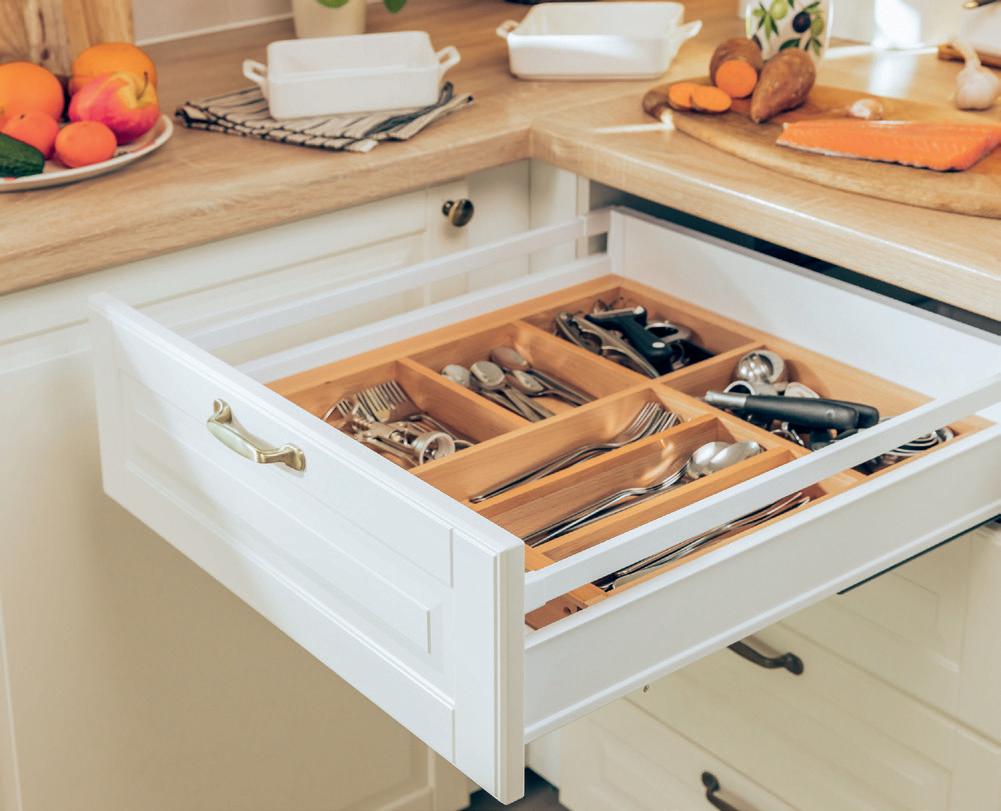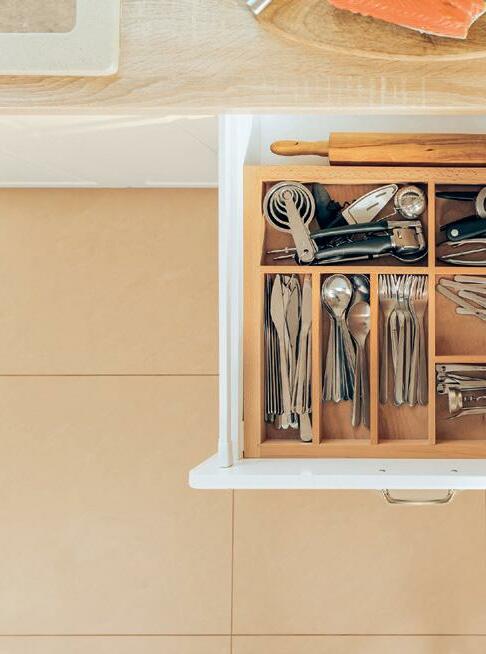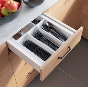 – W przypadku pozostałych sztućców obiadowych zdecy dowanie sprawdzą się szufladowe organizery, które oprócz schludnego wyglądu zapewniają szybką segregację łyżek, noży i widelców – na przykład po zmywaniu. Niekiedy mo żemy spotkać odkryte stojaki na sztućce, które stanowią część ozdoby kuchni, jednak w przypadku mniejszego metrażu zabierają cenną przestrzeń do gotowania – mówi Aldona Mioduszewska.