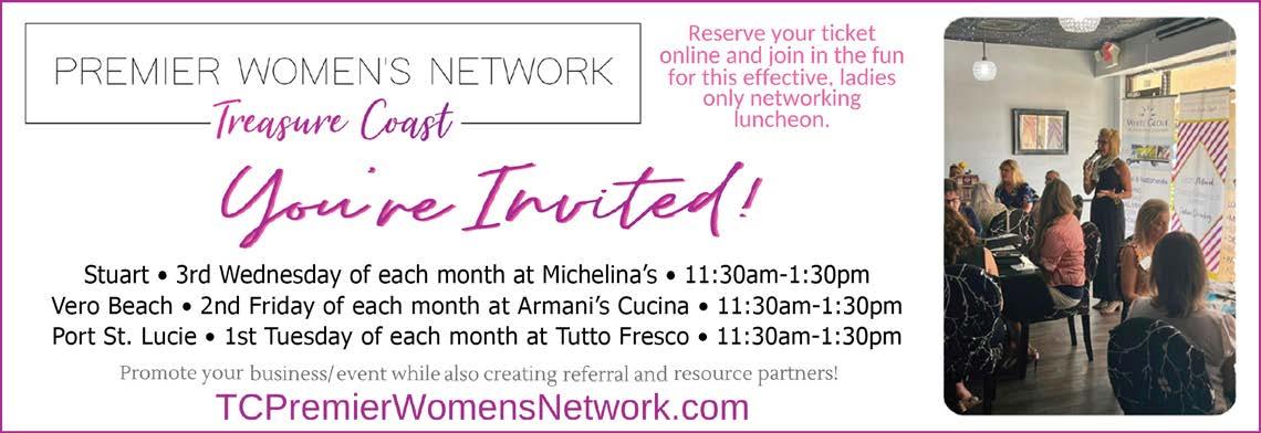 Support LOCAL Let’s Indian River St. Lucie Martin 1281 Old DIxie Hwy Vero Beach, FL 32960 772-569-4247 info@truecolorssalon.com www.truecolorssalon.com SEPTEMBER HAIR TIP: Wash with Cold Water to seal hair cuticles, preventing color molecules from escaping and fading. 2460 SE Federal Hwy., Stuart • 772-223-1212 intheShadeFlorida.com Same owner, established 1987. Representing HunterDouglas Gallery of Widow fashions Creating your vision of home. 9501 Brandywine Lane, Port St. Lucie, FL 34986 Open daily 11am-10pm tuttofrescopsl.com Fine Italian cuisine at its best! Now Open in Harbour Bay Plaza CRAFTED THE STORE 3766 SE Ocean, Stuart CUSTOM GIFTS UNIQUE THINGS FUN STUFF Rising Stars, Concert Legends, Rock ‘n Roll Hall of Fame Members, Grammy Winners, Comedy Superstars and Special Events of all kinds, for over 16 years the Sunrise Theatre has been the Treasure Coast’s #1 destination for live entertainment. www.sunrisetheatre.com 117 S 2nd S. Fort Pierce, FL 34950 Treasure Coast Home & Living 21