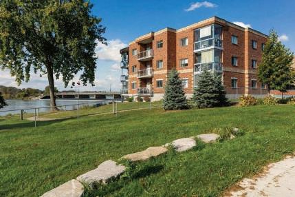 GRAND RIVERFRONT CONDO 2 beds + office, 2 full baths, 2 balconies & 2 parking spaces. Open concept. Dining w/sliding doors to enclosed balcony overlooking river. Large master bed w/ balcony & 5pc ensuite. Dunnville