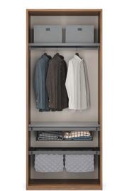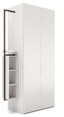 EN Detail of Panorama opening system and metal frame partition in Perry hinged door wardrobe. Opposite: detail of wardrobe in two different depths.