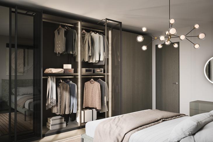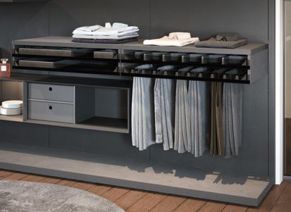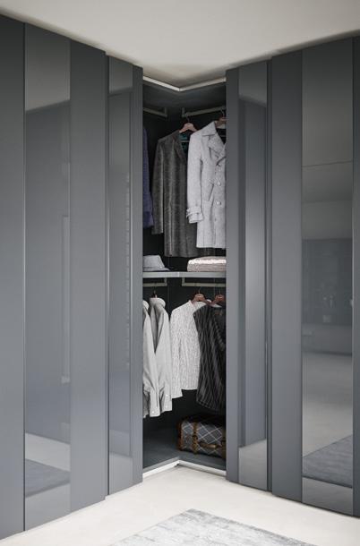 IT Dettaglio dell’apertura Panorama e del divisorio telaio nell’armadio anta battente Perry . Nella pagina accanto, dettaglio dell’armadio con doppia profondità.