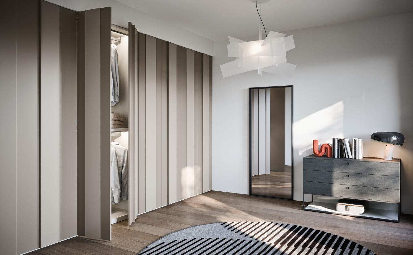 IT Armadio anta pieghevole Alfa in finitura rovere chiaro con maniglia Scratch 544 in laccato metal stagno, interno in finitura tweed. Comò Sly in laccato opaco