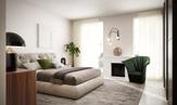 Alfa hinged door wardrobe in rovere grigio finish, push-to-open mechanism. Tufté bed in Bonnie 21