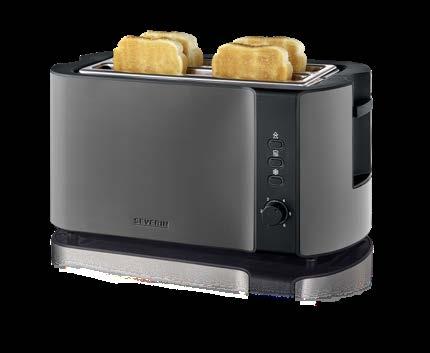 De broodrooster met extra lange sleuf Steeds meer mensen kopen ambachtelijk gebakken brood, steeds meer hobbykoks bakken hun eigen variant. Brood evolueert, van inhoud maar ook van vorm, en dus moeten de broodroosters mee evolueren. Daarom heeft het Duitse Severin een nieuw broodrooster op de markt gebracht dat het traditionele toestel op een hoger niveau brengt. De AT 9341 automatische broodrooster is voorzien van een RVS behuizing die de warmte extra goed isoleert. Het brood wordt aan beide kanten gelijkmatig verwarmd, het kan worden ontdooid maar ook opgewarmd en de kruimels worden opgevangen in een apart uitneembare lade. Maar minstens zo belangrijk is dat de sleuf extra lang is gemaakt. Daardoor is er plek voor vier stukken brood tegelijk, terwijl broodjes hun plek vinden in een apart opzetstuk. De broodvorm varieert, de broodrooster evolueert mee, althans, die van pionier Severin. De AT 9341 automatische broodrooster maakt deel uit van een ontbijtset,