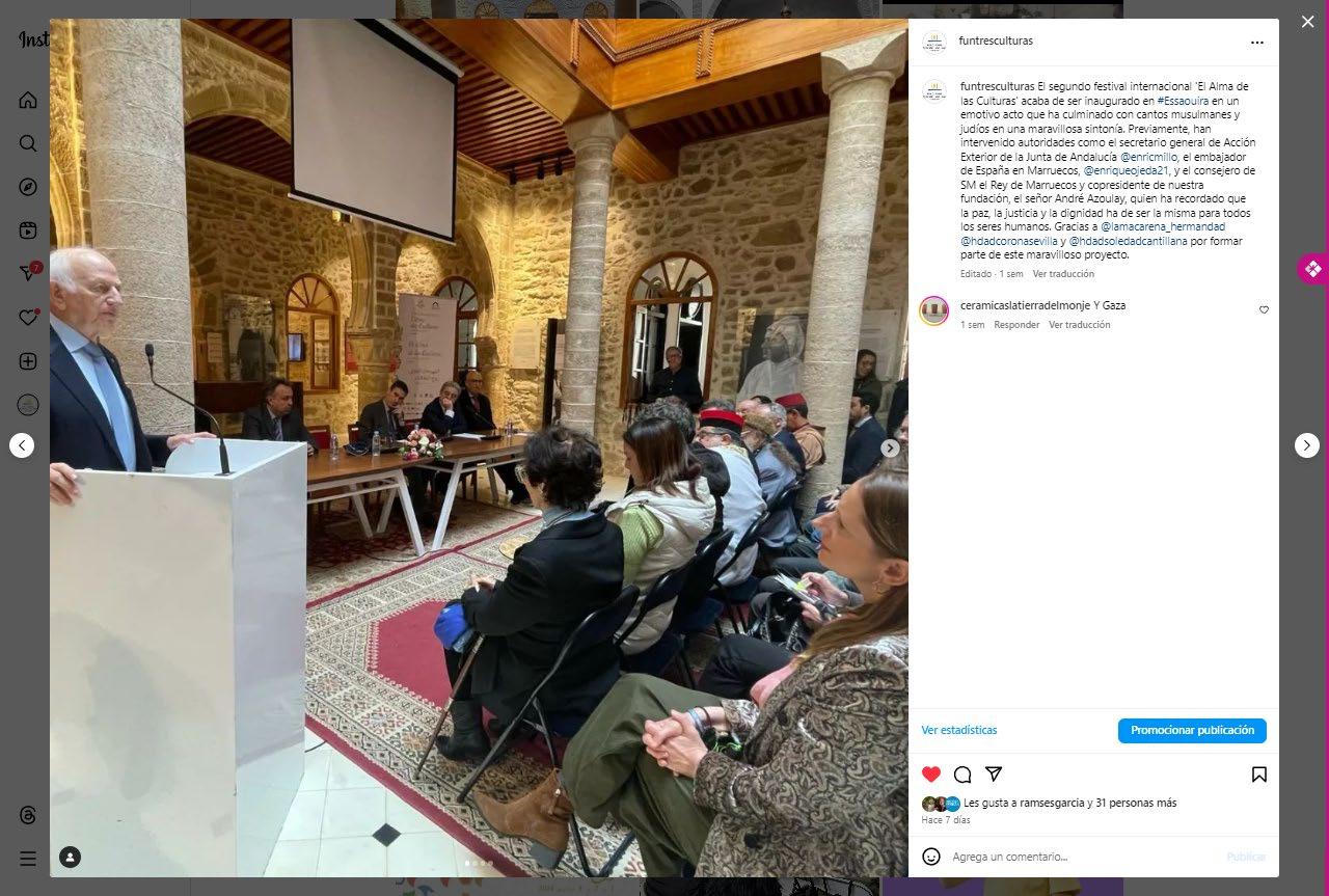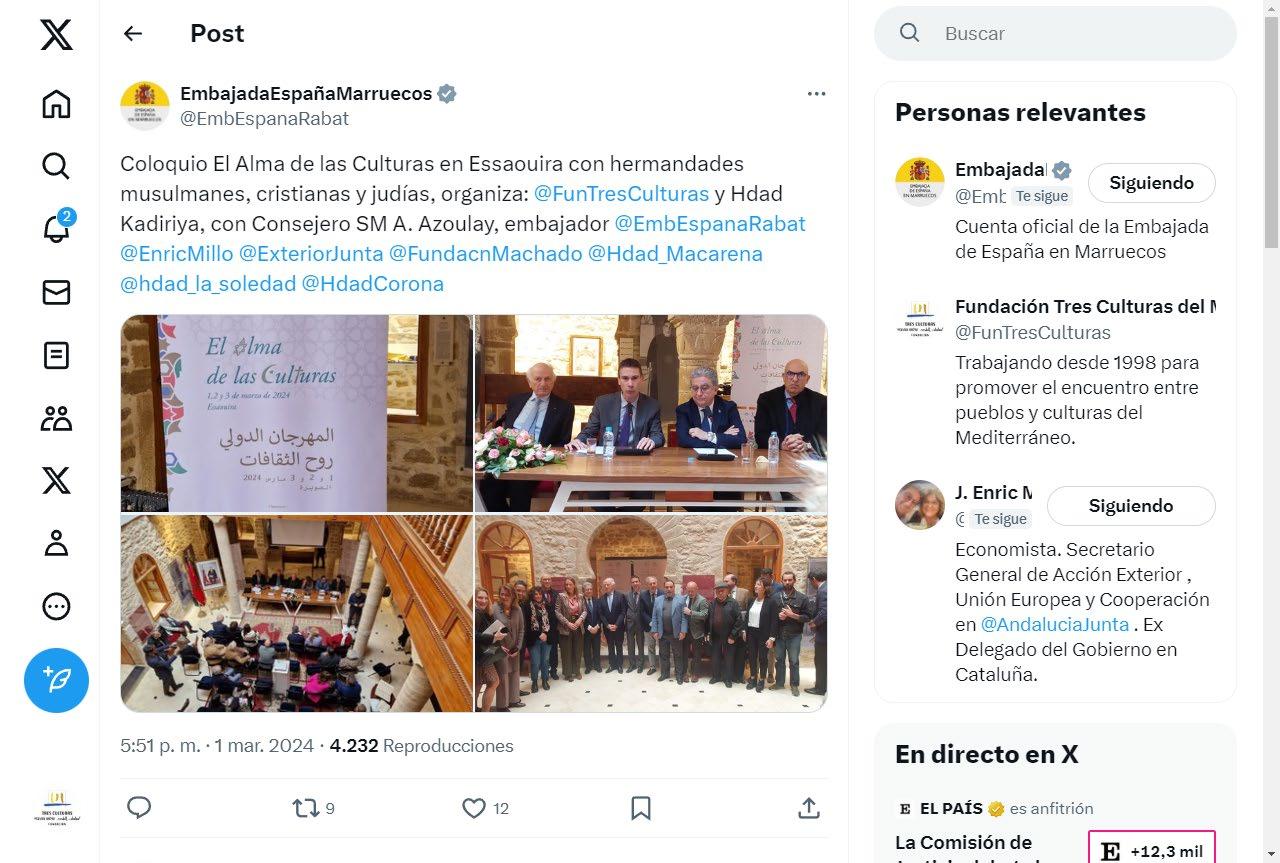 Este programa será inaugurado el día 1 por André Azoulay, copresidente de la Fundación Tres Culturas y consejero del Rey de Marruecos; Enrique Ojeda Vila, que acaba de acceder al cargo como embajador de España en el Reino de Marruecos; Enric Millo, secretario general de Acción Exterior, Unión Europea y Cooperación de la Consejería de Presidencia, Interior, Diálogo Social y Simpli cación Administrativa y Tarik Ottmani, alcalde de Essaouira, junto a Lorena García de Izarra,directoradelaFundaciónTresCulturas,segúninformalacitadafundaciónenunanotade prensa