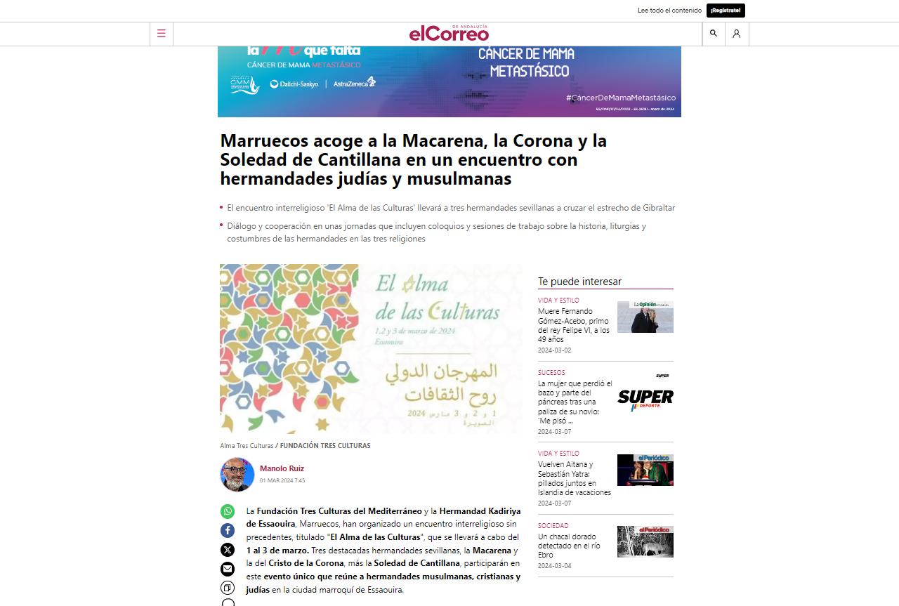 UnencuentrosinprecedentesLashermandadesdelaMacarena,elCristodela CoronaylaSoledaddeCantillanaparticiparánelpróximofindesemanaenel encuentroElAlmadelasCulturasquesecelebraráenMarruecosPorprimera vez,lascofradíassevillanasexpondráncómosevivelareligiosidadpopularenun encuentroúnicoypioneroensugénero,unasjornadasdeconvivenciaentre hermandadesmusulmanas,cristianasyjudíasenlaciudadmarroquídeEssaouira organizadoporlaFundaciónTresCulturasylaHermandadKadiriyadeesta localidad