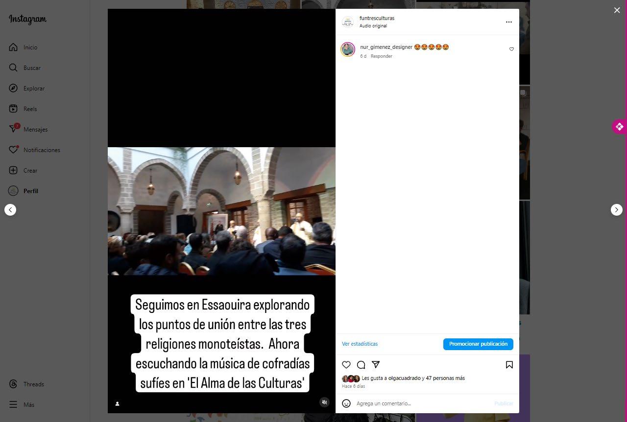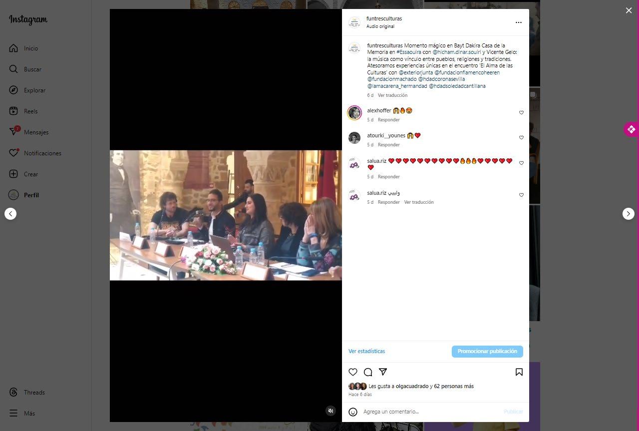 InternacionalElAlmadelasCulturasque,juntoaestassesionesdereflexiónydebate,incluye conciertospropuestasculturalesyencuentrospropiosdelastresreligionescomounaveladasufíuna ceremoniajudíaenlaSinagogadeEssaouirayunamisacantadaenlaIglesiadeNotreDamedeesta mismaciudaddondesecontaráconelgrupoHerenciadelaFundaciónCristinaHeeren