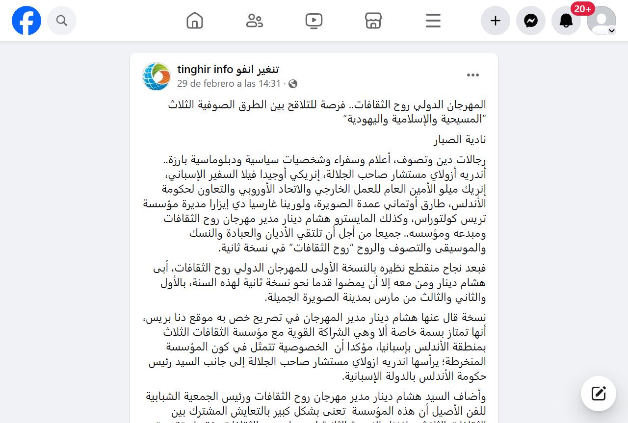 Domingo,3demarzoAlas11:00,enlaiglesiaNôtreDamed’Essaouira,se celebraráunamisacantadaporelgrupoHerenciadelaFundaciónCristinaHeeren Entrelas12:30ylas14:30,tendrálugarelúltimocoloquio:Delaespiritualidadala fraternidad,atravésdelacaridad Uncaminodeconcordiaenlastresgrandes religionesdelLibro SerámoderadoporJoséMaríaDavó,consejeroCulturaly CientíficodelaEmbajadadeEspañaenelReinodeMarruecosIntervienen:Rabie Rashidi,profesoreinvestigadordehistoriadelasreligionesconlaponencia ExtensionesdelsufismomarroquíenlaPenínsulaIbérica YassinBenRawan, investigadorenpensamientoislámico,quehablarásobreLaculturadetolerancia enlossufíesdelSáharamarroquí RachidTalha,investigadorensufismomarroquí Elroldelsufismoenladifusióndelosvaloresdepazydetolerancia AlejandroD MateosGallegos,delaHermandaddelCristodelaCorona:Lashermandades comoinstrumentoindispensabledelaDeclaracióndelaFraternidadHumana Porúltimo,sepondránencomúnlasconclusionesyfirmaráelmanifiesto:Dela espiritualidadalafraternidad,haciauncaminodeconcordiaenlastresgrandes religionesdelLibro