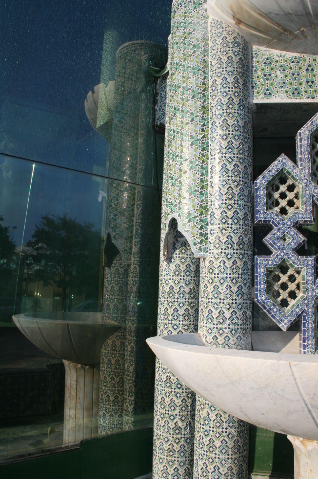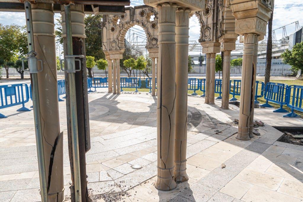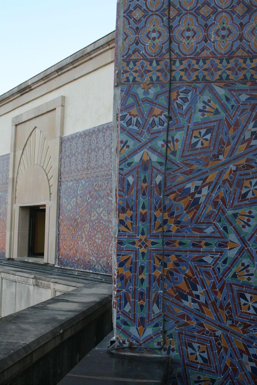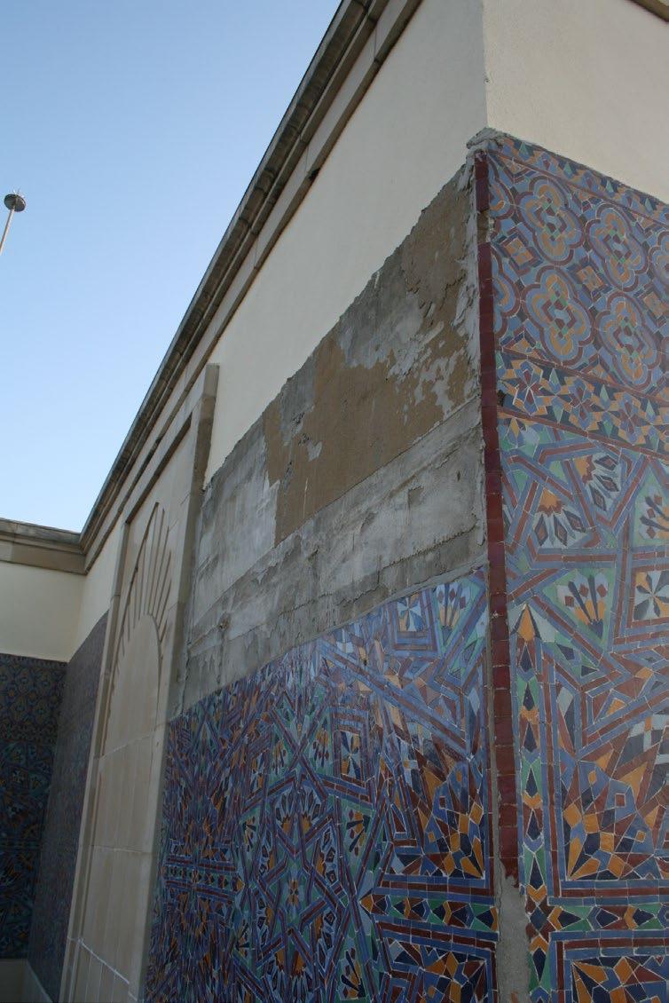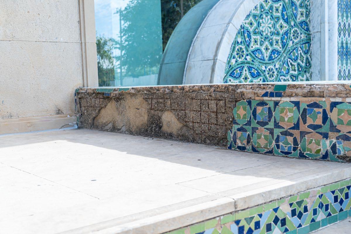 La façade sud étant plus exposée aux variations de température, la dilatation et l'absence de joints provoquent le décollement de la mosaïque. Le détachement de la mosaïque en zellige est très visible dans les fontaines monumentales, dans les jardinières extérieures et sur les marches de l'entrée et du côté est.