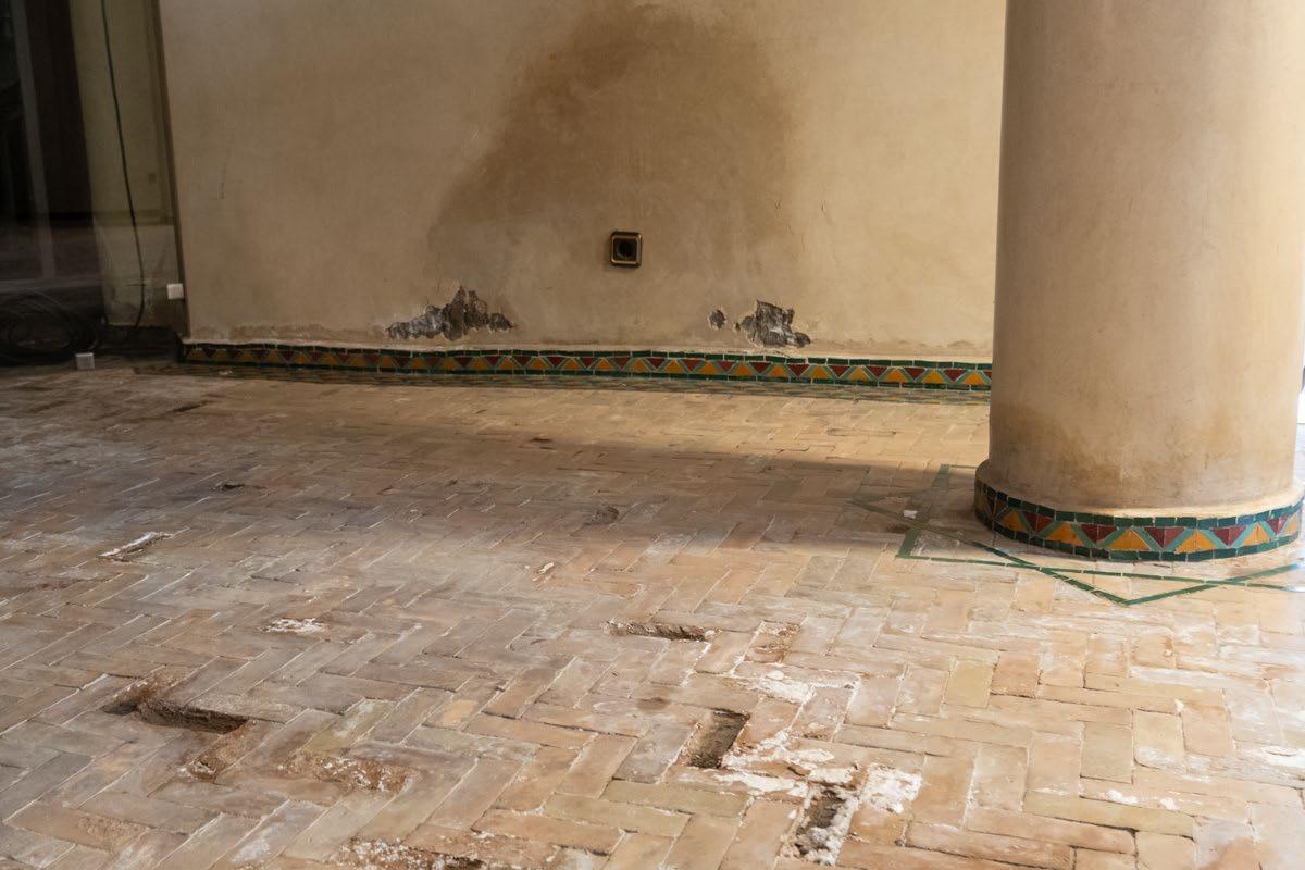 La visite au rez-de-chaussée s’est centrée expressément sur l’espace du patio central et, plus particulièrement, sur le dallage en mosaïque du sol. La célébration fréquente d’événements et le montage et démontage d’installations sur le dallage a provoqué le détachement de pièces de mosaïque.