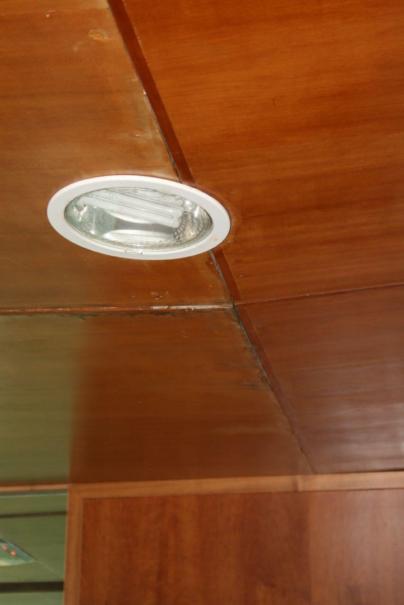 • PHOTOS E06 et E07 : cassures et humidités sur les faux plafonds, dans la zone d’accès à l’auditorium. Des fragmentations, des taches et des renflements sur certains endroits ont pu être observés. La réparation comprendra l’élimination des surfaces affectées et sa substitution, moyennant un ancrage avec des tiges métalliques (éviter l’utilisation de tiges de bambou), révision des points d’union et peinture ultérieure.