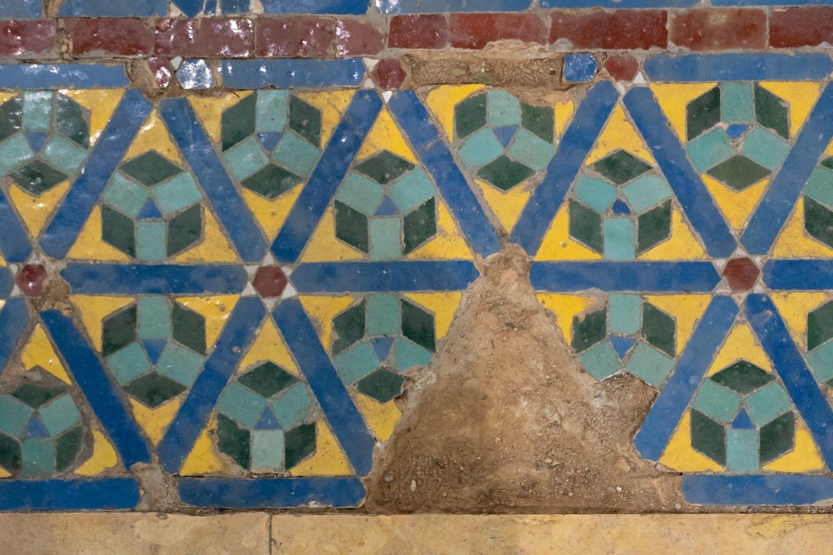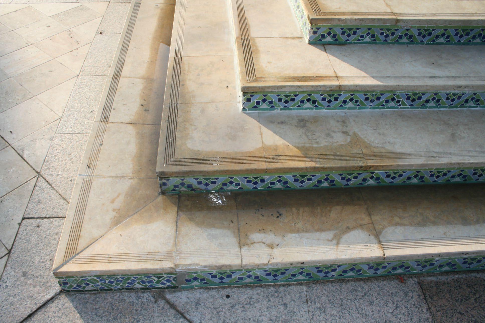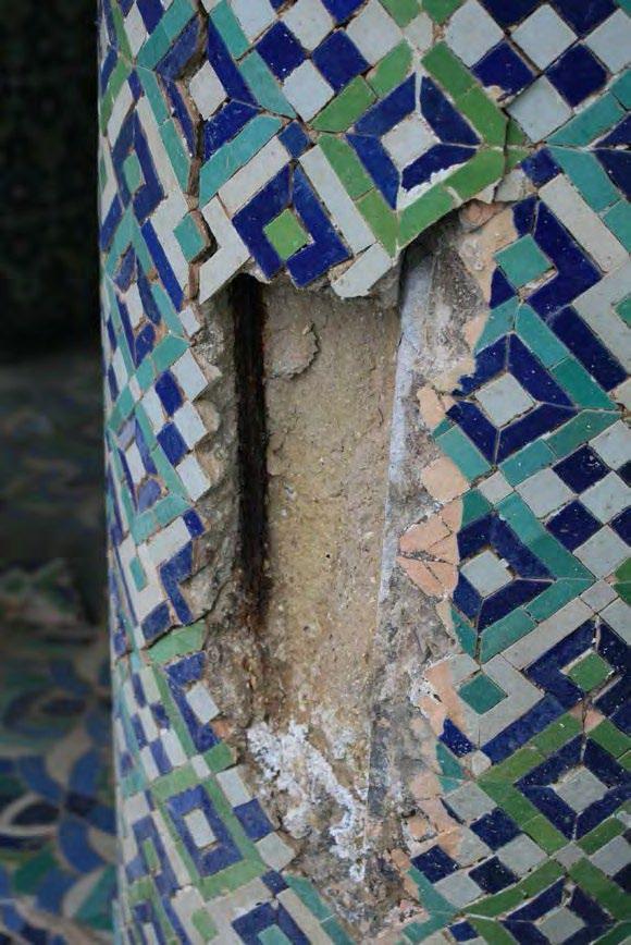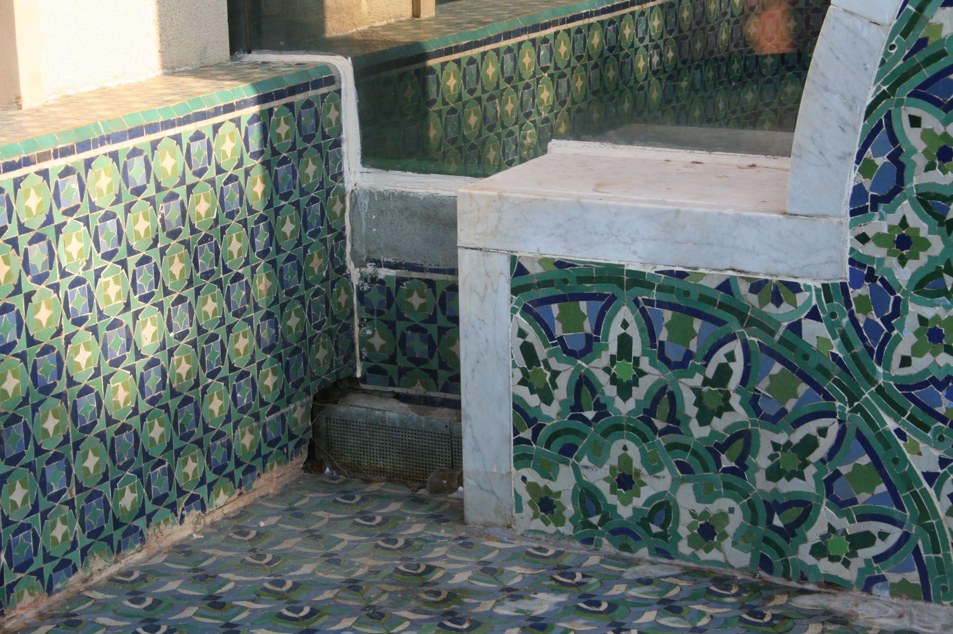 Détérioration du zellige périphérique de la fontaine intérieure. L'usage a provoqué le détachement des pièces les plus lâches et certaines pièces ont perdu leur glaçure.