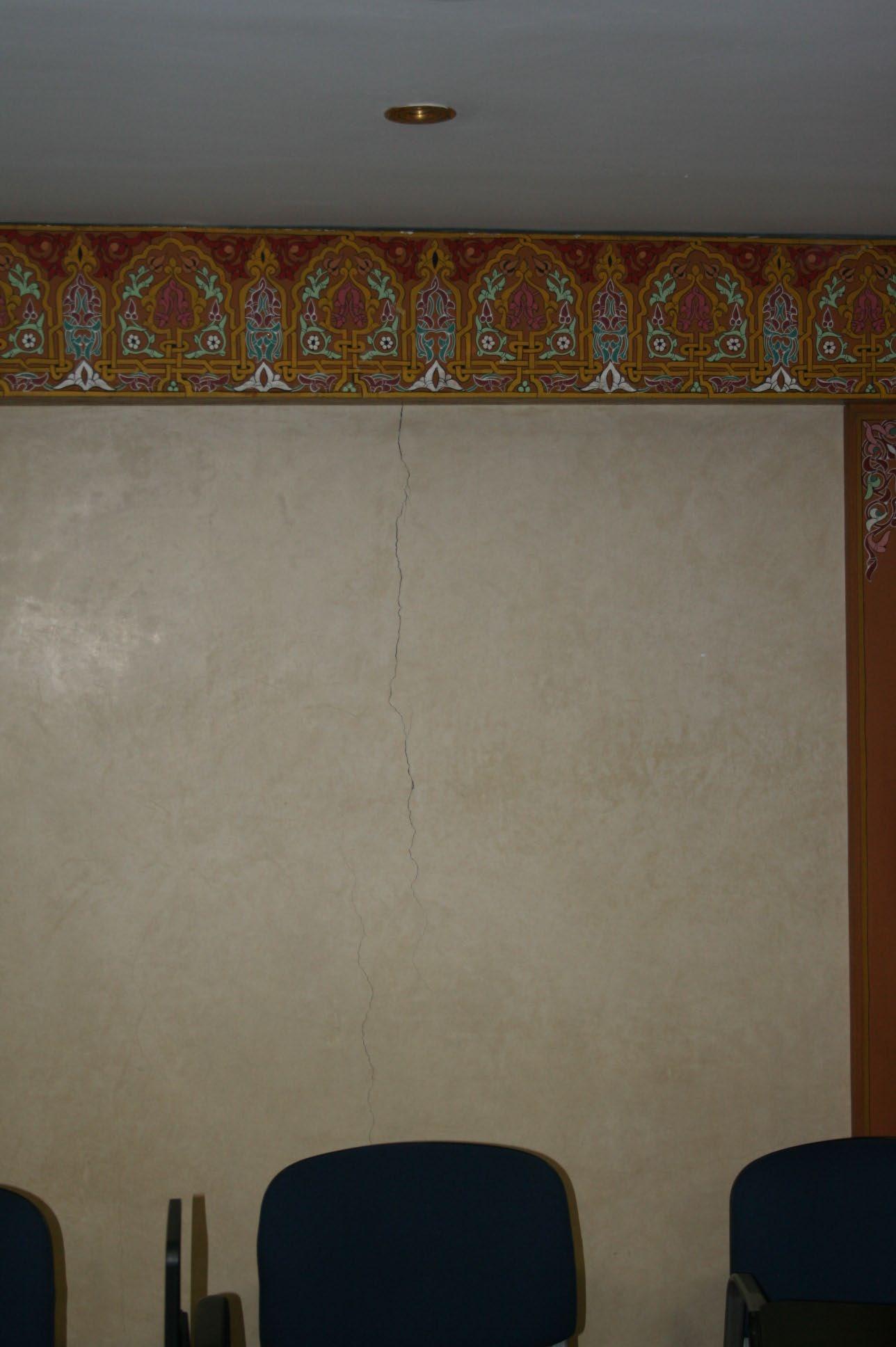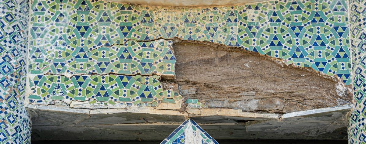• PHOTOS B01, B02, B03, B04, B05 et B06 : détachements et dégâts des plaques de mosaïques décoratifs. Il y a des détachements ponctuels jusqu’à pan de murs complets (PHOTO B01).