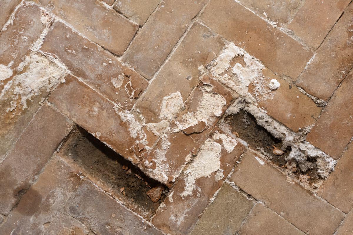 • PHOTO E03 : dallage disposé en épi des pièces annexes jusqu’à l’accès à l’auditorium. L’humidité du sol a provoqué la dégradation et la désagrégation des pièces de céramique.