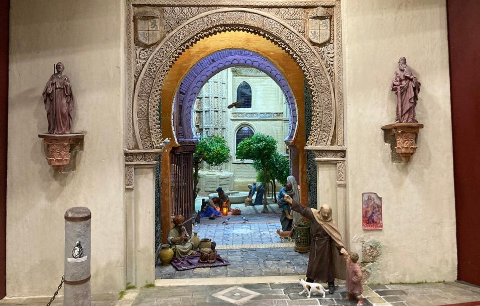 Este belén, de estilo diorama, mostraba una escena de la Natividad siguiendo un estilo costumbrista en la Puerta del Perdón de la Catedral de Sevilla, apreciándose detalles arquitectónicos del templo, de forma que la Sagrada Familia se situaba en el Patio de los Naranjos junto a otros personajes.