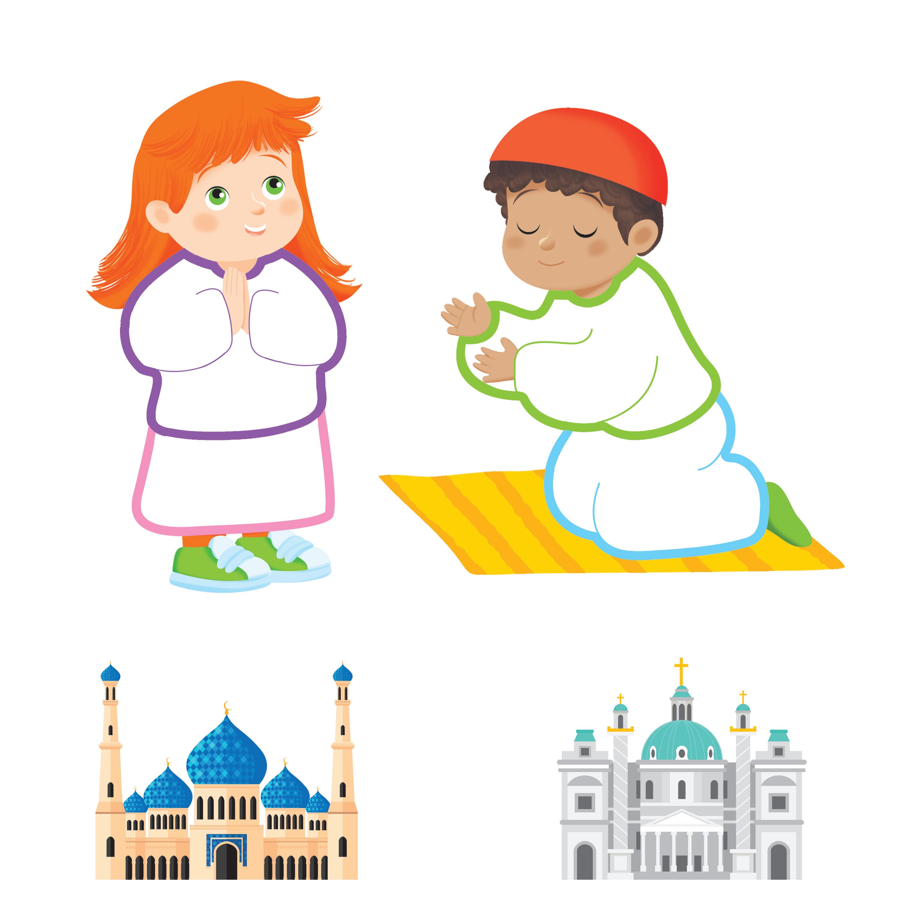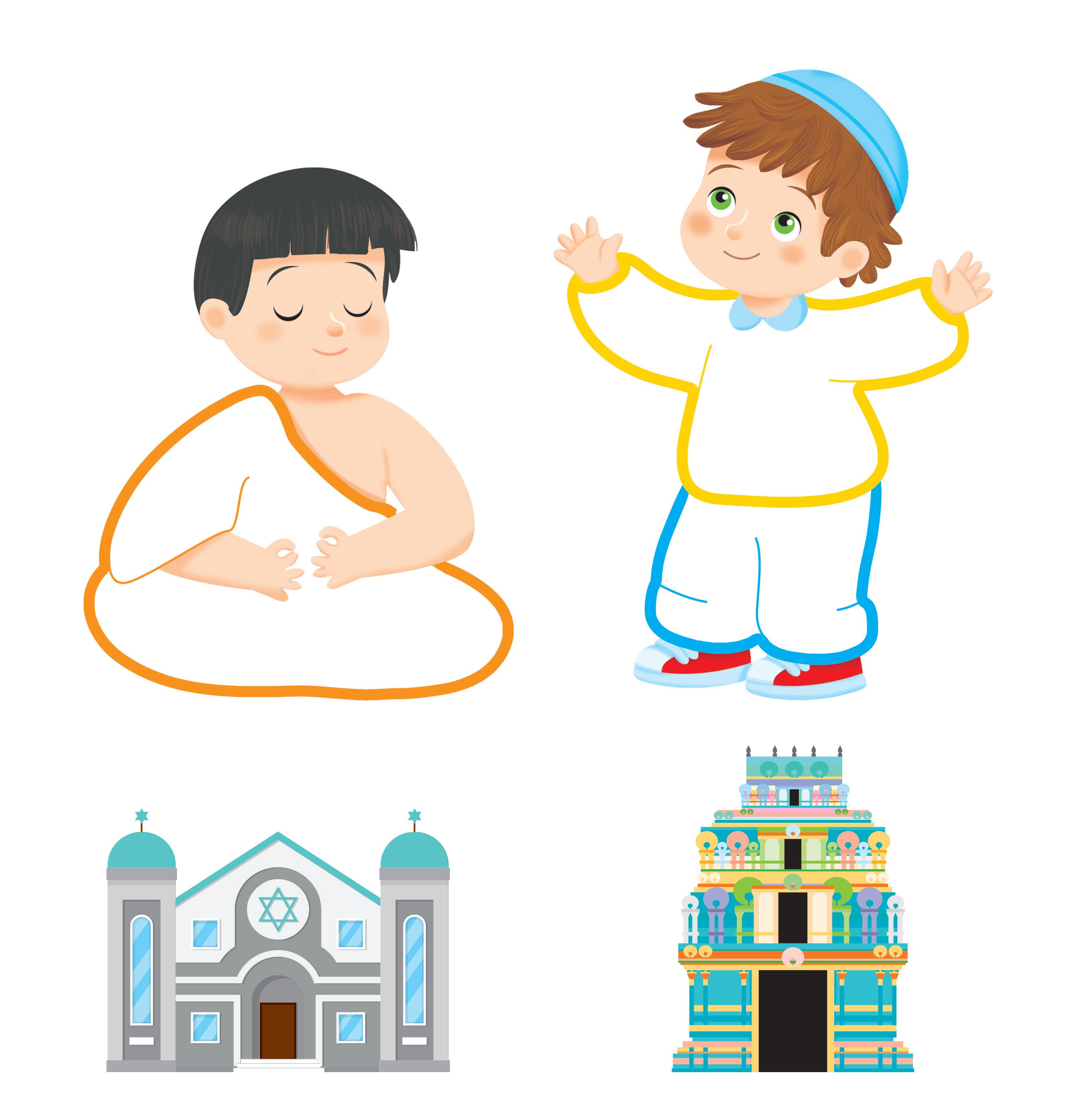 Collega ogni bambino all’edificio religioso corrispondente. Colora.