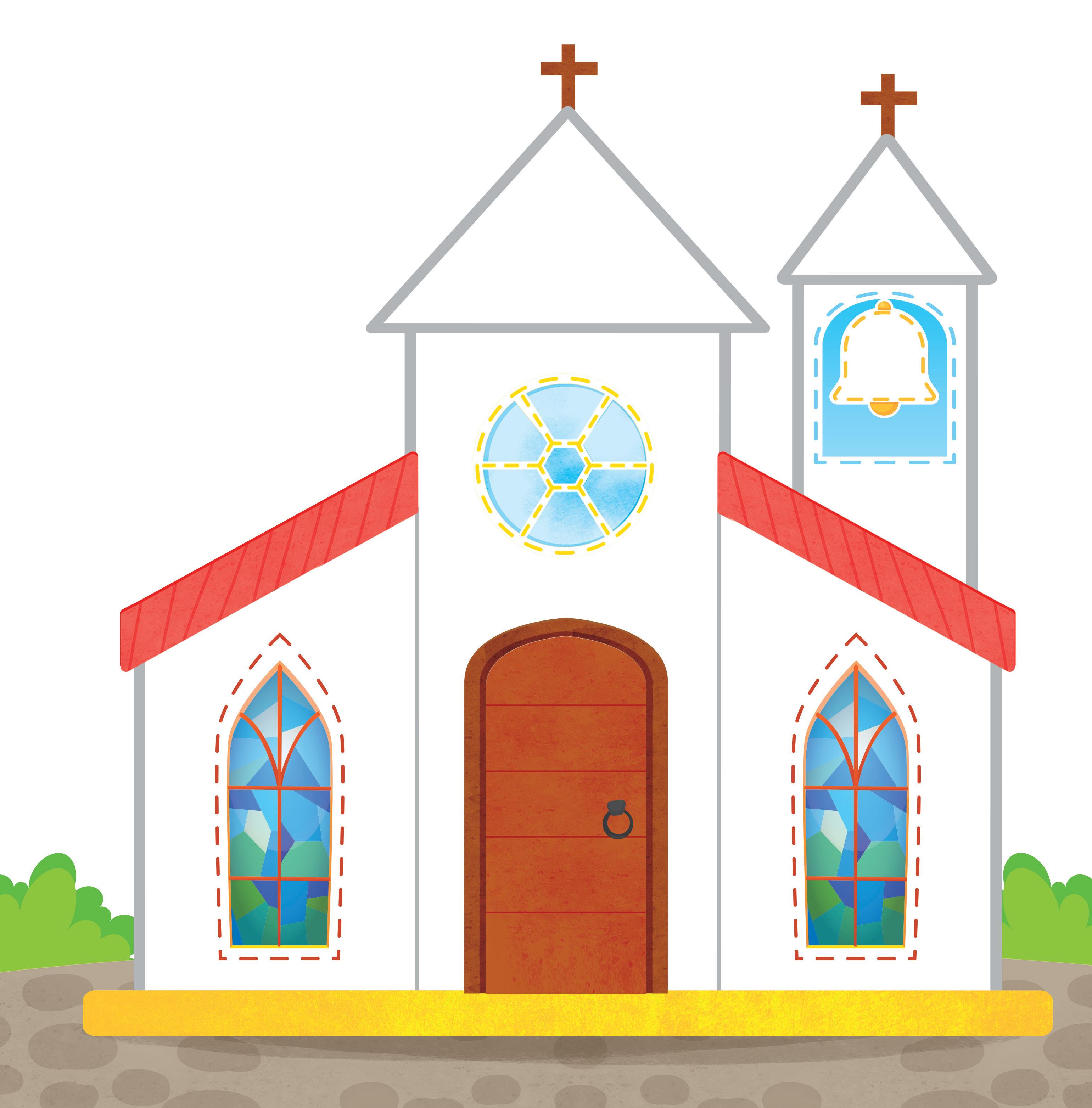 Ripassa i tratteggi. Completa la chiesa seguendo le indicazioni di colore date.
