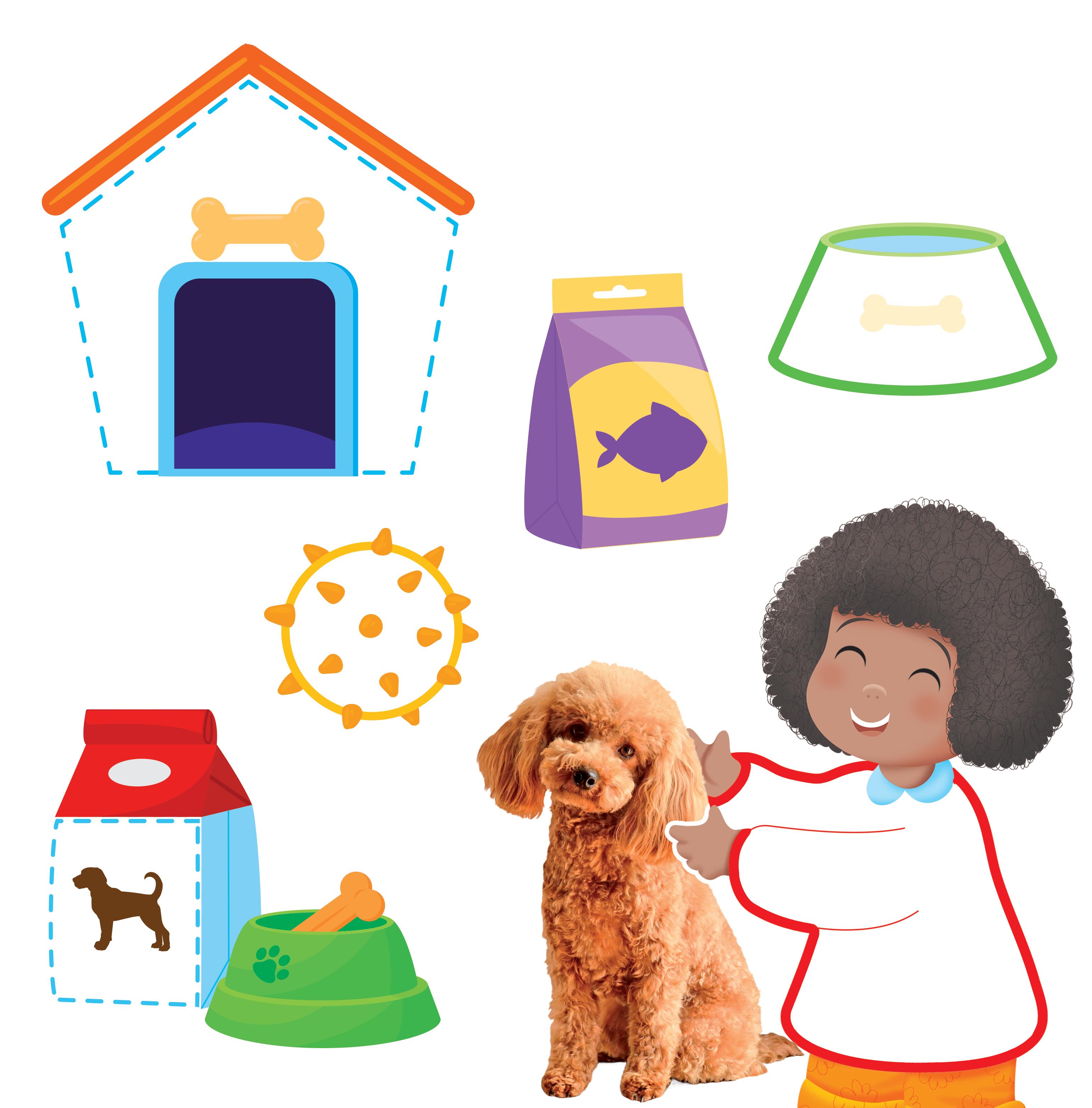 Ripassa i tratteggi. Completa solo i pallini accanto agli oggetti utili al cane. Colora.