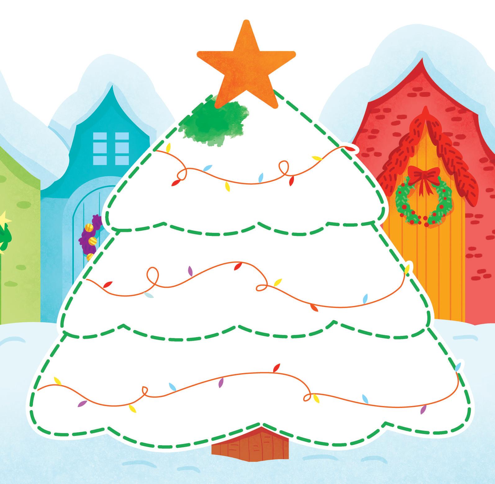 PERCHÉ L’ALBERO È DECORATO? RIPASSA I TRATTEGGI E DIPINGI CON L’ACQUERELLO VERDE.