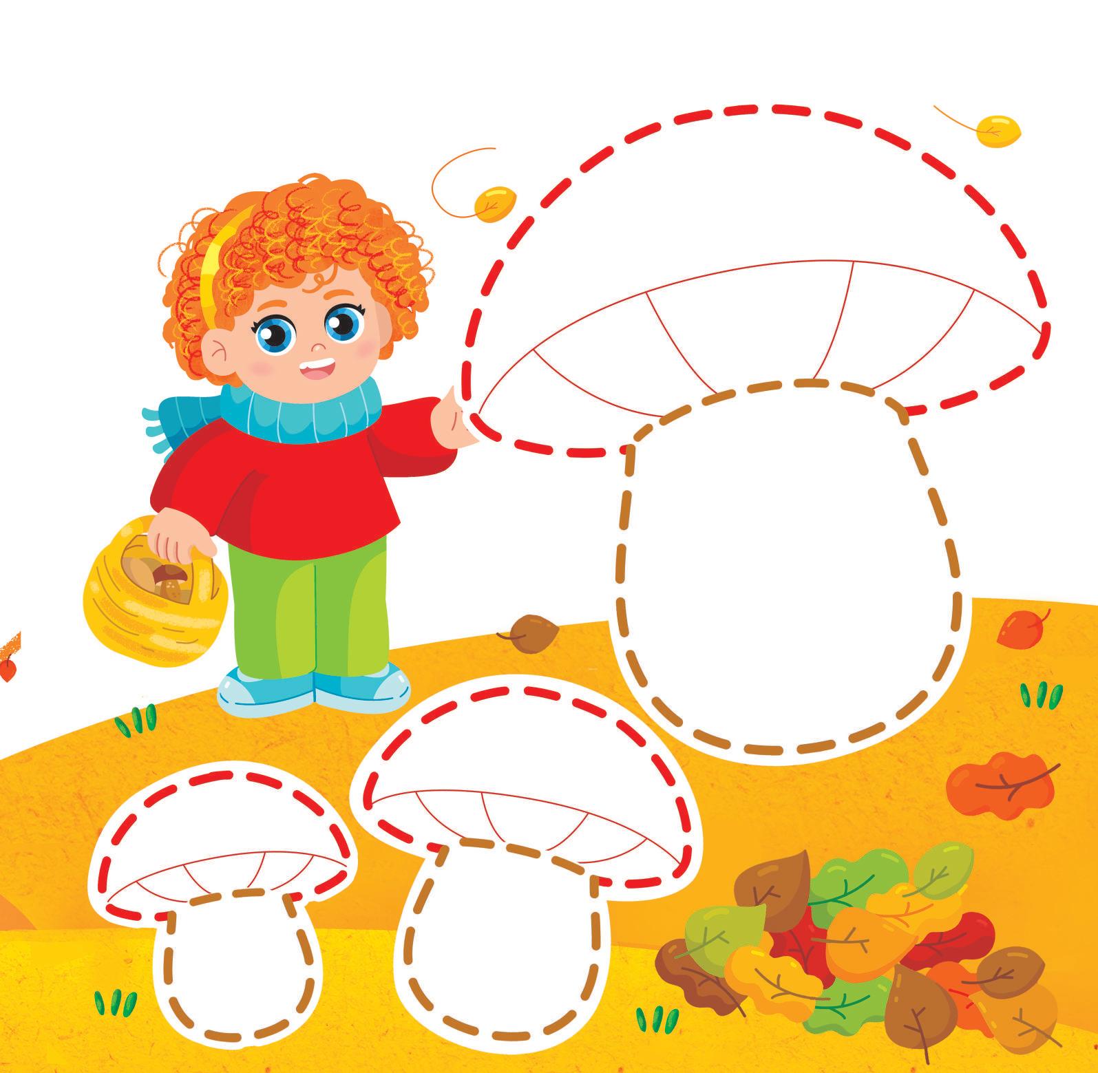 COSA STA RACCOGLIENDO LA BAMBINA? RIPASSA I TRATTEGGI E COLORA SOLO IL FUNGO GRANDE. Obiettivo: Confrontare grandezze e distinguere i concetti “piccolo/medio/grande”.