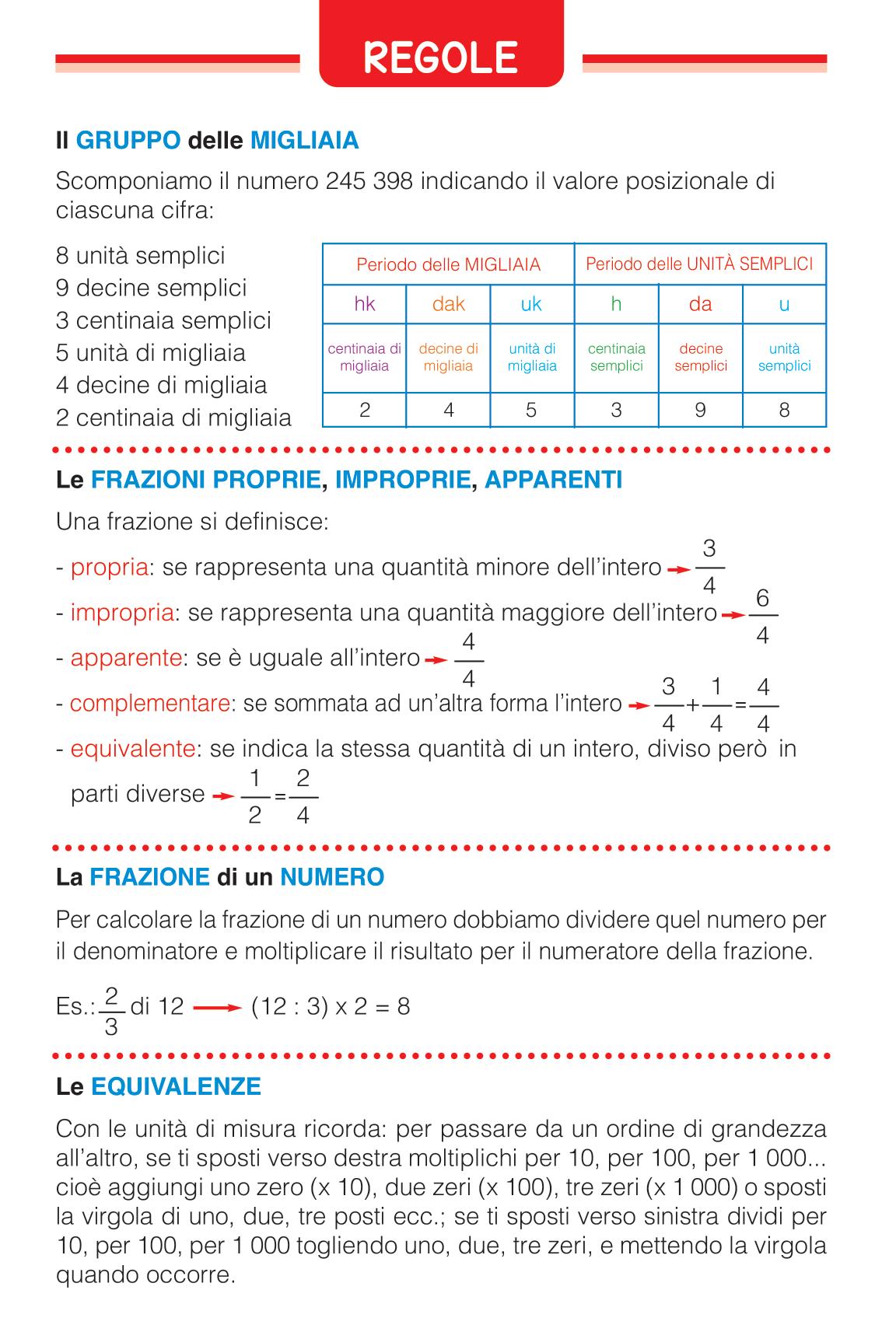 Oltre il 1 000 Numeri e... ...numeri Mi esercito con i numeri Addizioni tra le nuvole Addizioni in colonna Sottrazioni al vento Sottrazioni in colonna Problemi di addizioni e sottrazioni Moltiplicazioni... tra i fiori Moltiplicazioni in colonna Divisioni... in montagna Divisioni in colonna Moltiplicazione o divisione? Quanto tempo? Multipli Divisori Frazioni Complementari ed equivalenti Frazioni a confronto Le frazioni di un numero Problemi di frazioni Le frazioni decimali Dalle frazioni decimali ai numeri decimali