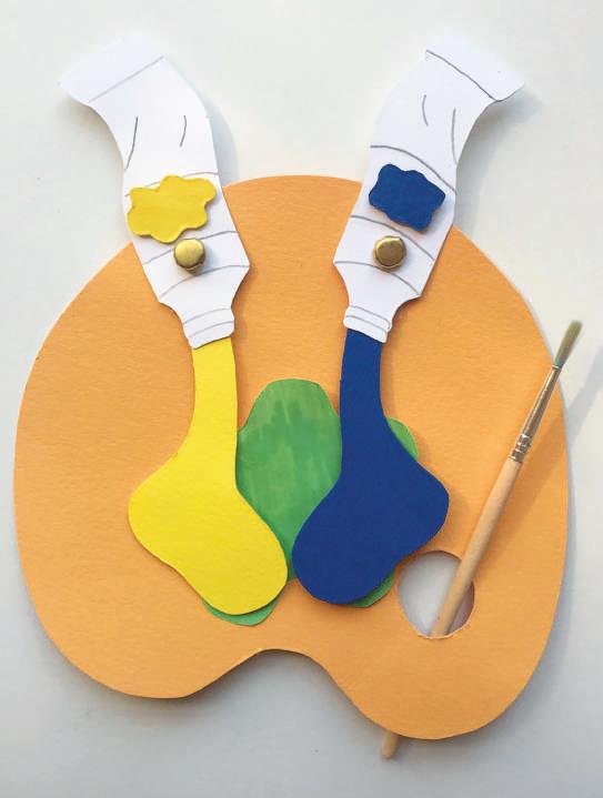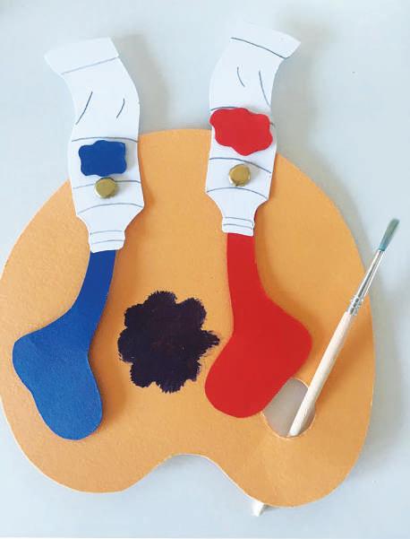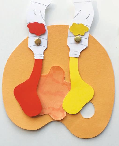 Fissiamo i tubetti alla tavolozza, sempre utilizzando i fermacampioni. Infine, completiamo aggiungendo il colore che si ottiene mescolando quelli primari: pos siamo realizzarlo sempre con una macchia di cartoncino, incollandola, oppure direttamente con le tempe re, come mostrato nelle immagini.