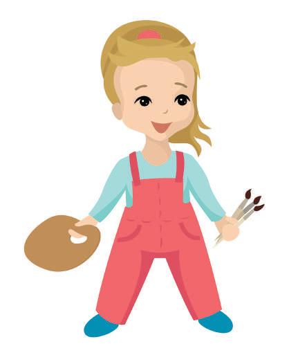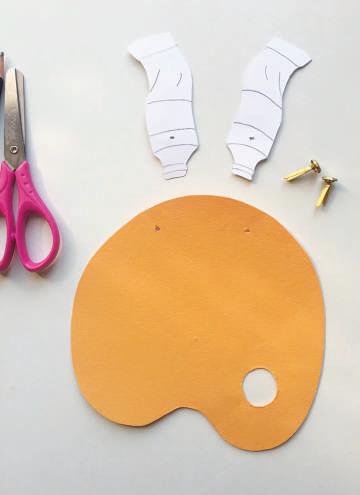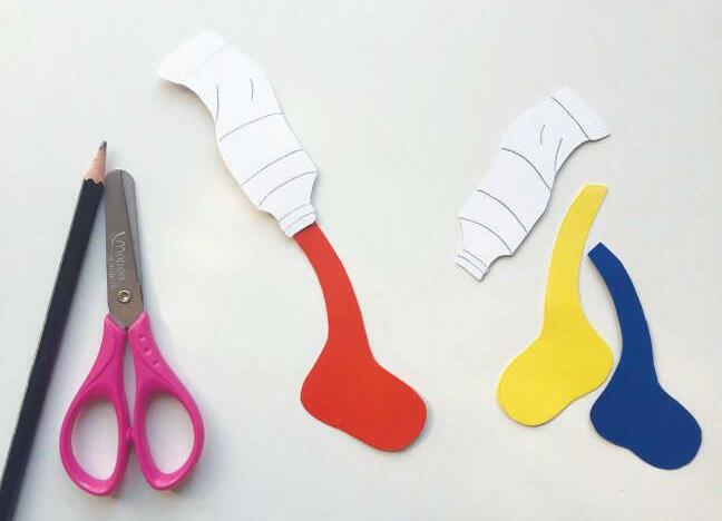 Dal cartoncino arancione ritagliamo la sagoma di una tavolozza e utilizziamola per realizzarne altre tre. Dal cartoncino bianco disegniamo e ritagliamo sei tubetti di colore.