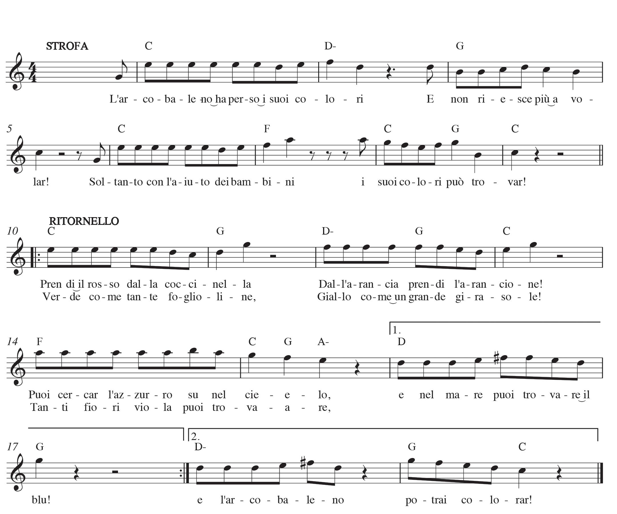 Prendi il rosso dalla coccinella, dall’arancia prendi l’arancione, puoi cercar l’azzurro su nel cielo e nel mare puoi trovare il blu! Verde come tante foglioline, giallo come un grande girasole, tanti fiori viola puoi trovare, e l’arcobaleno potrai colorar!