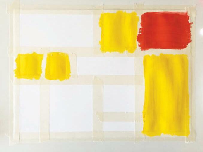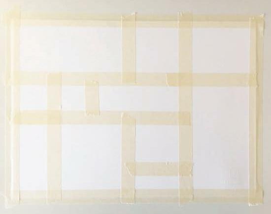 Prendiamo un foglio ruvido, fissiamolo con il nastro di carta per non farlo muovere e dividiamolo in riquadri di diverse dimensio ni, attaccando strisce verticali e orizzontali di nastro adesivo.