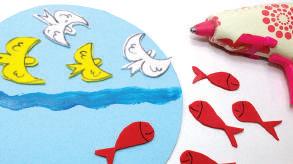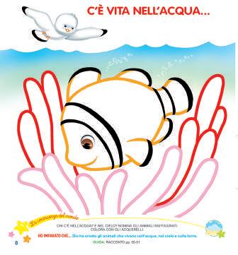 • Pesciolini e uccellini colorati e incollati su acqua e aria.