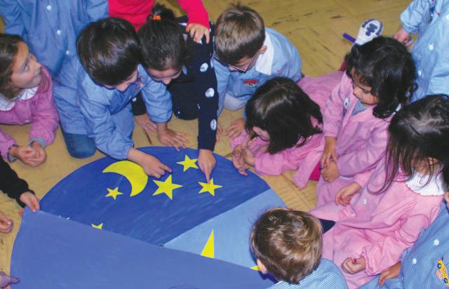 L’insegnante intanto abbassa le tapparelle lentamente. I bambini (avvisati in precedenza) capiscono che è il momento di riposizionarsi: il Sole gira la sua collana dalla parte della Luna, poi si siede al centro dell’aula come un indiano. Gli altri si distendono a terra, in gruppetti da cinque, in modo da riprodurre una stel la (si toccano le punte dei piedi) recitando la filastrocca.
