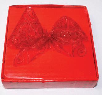 Se non abbiamo una scatola co lorata, dipingiamone una di ros so o del colore che si preferisce e incolliamo un bel fiocchetto sul coperchio.