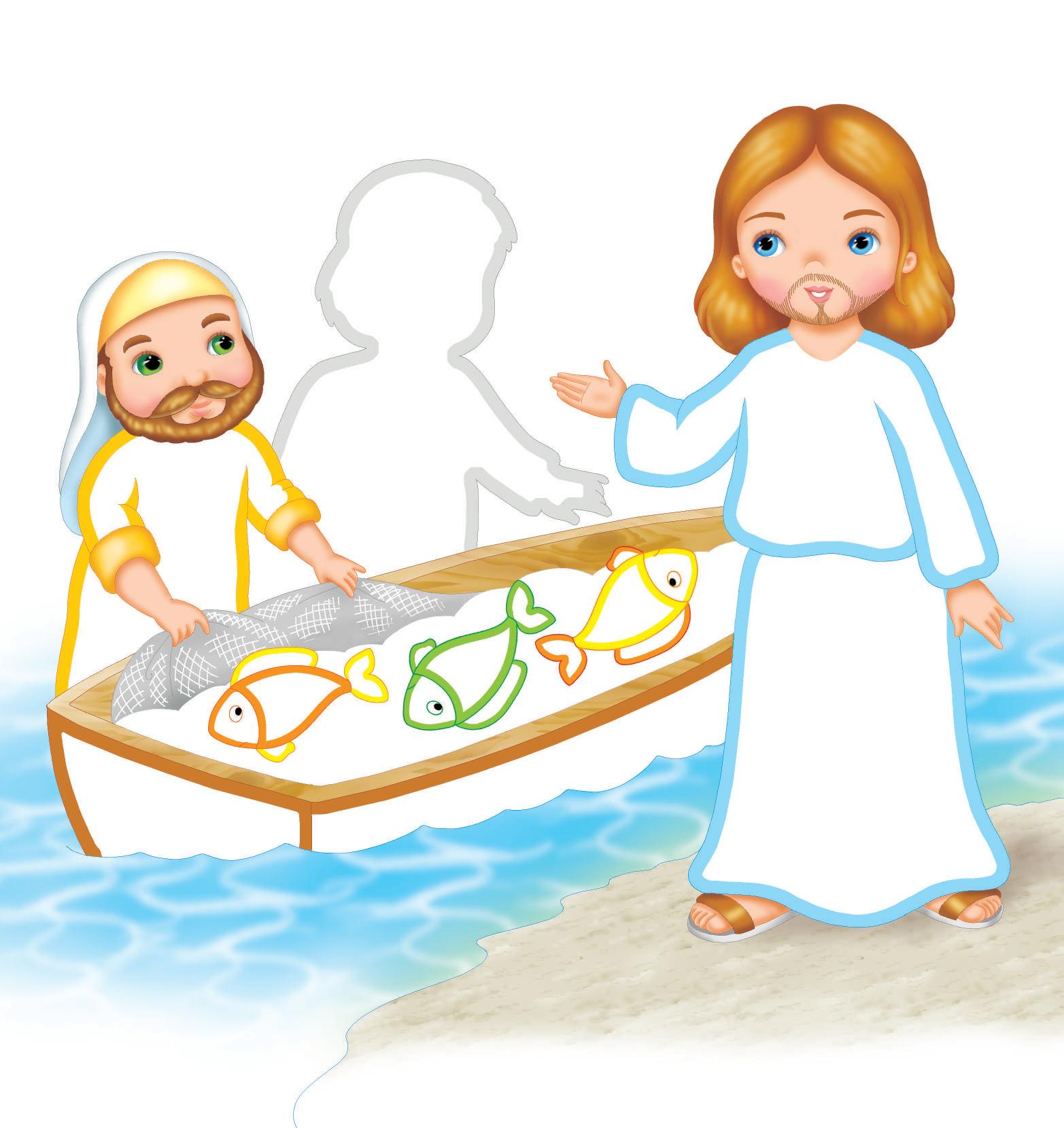 ASCOLTA IL RACCONTO DELLA PESCA MIRACOLOSA. CHE COSA DISSE GESÙ AI DUE PESCATORI? DISEGNA QUELLO MANCANTE E COLORA.
