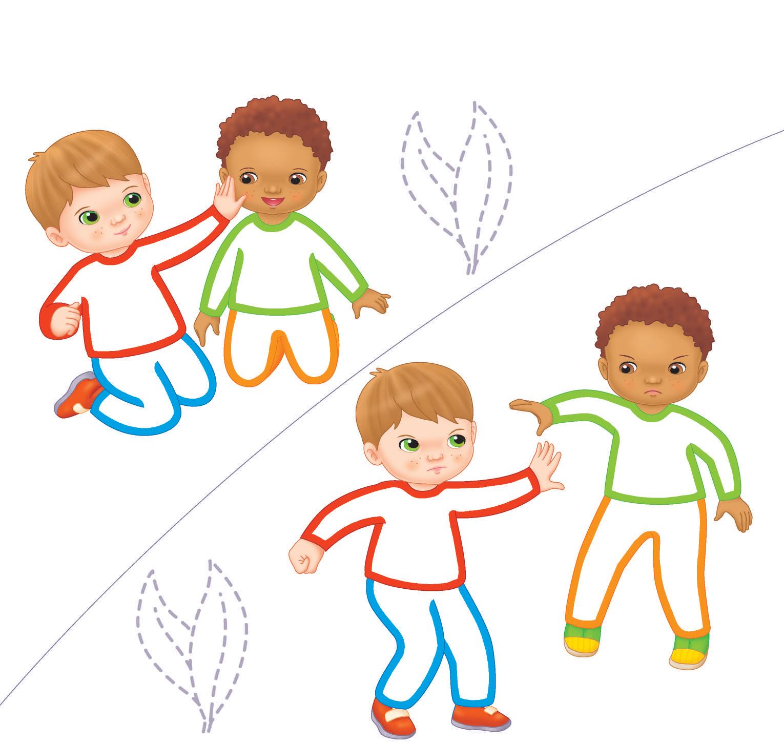 Osserva e descrivi le due scene. Ripassa il germoglio per indicare quella in cui i bambini sono “seminatori di pace”, poi colorala. Distinguere comportamenti che “seminano” la pace.