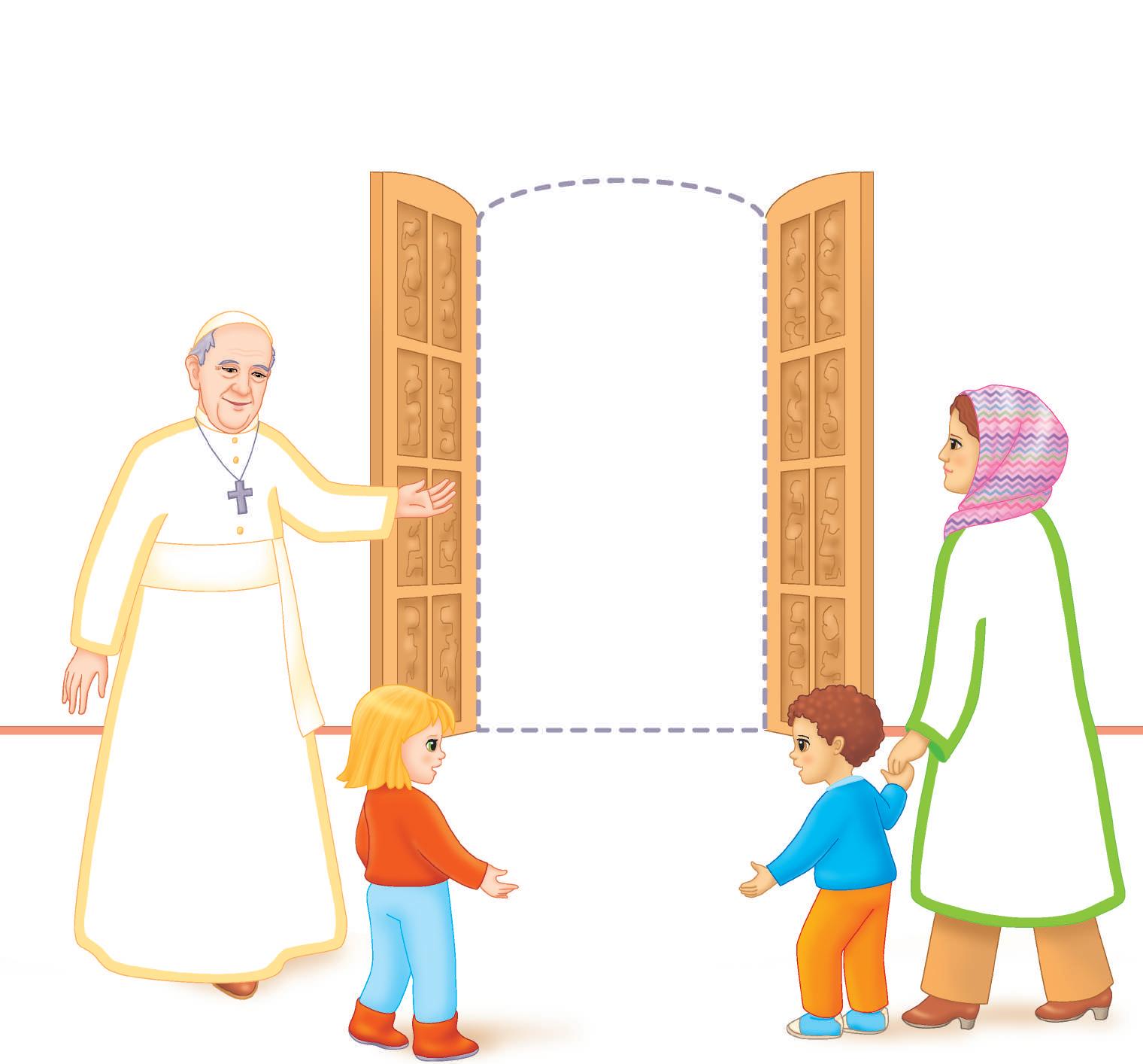 Osserva e descrivi la scena. Il Papa ci insegna ad accogliere tutte le religioni. Ripassa i tratteggi e colora. Cosa significa tenere aperta la “porta del cuore”? Valorizzare la pace tra le diverse fedi religiose, attraverso la figura di papa Francesco.
