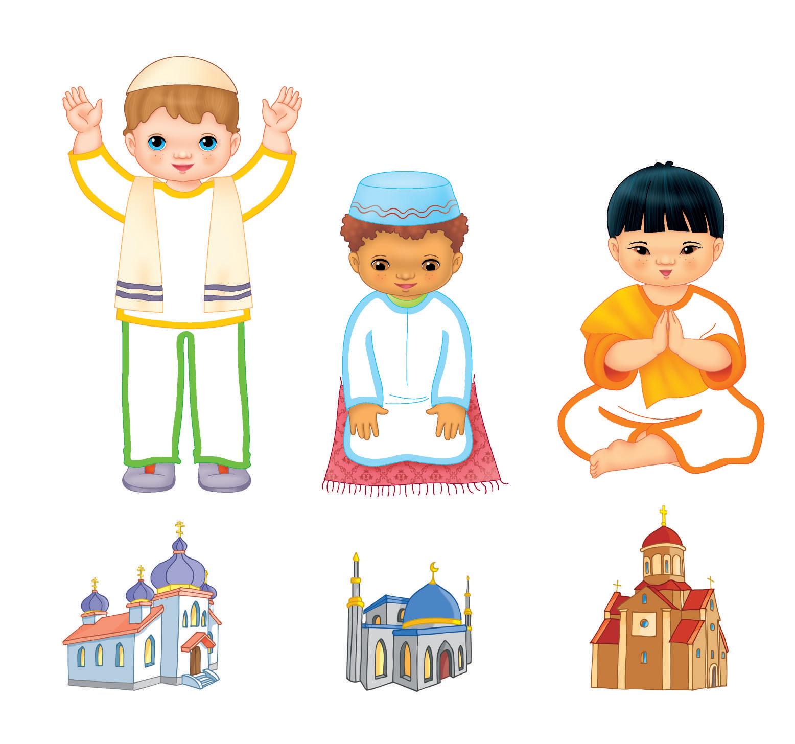 Osserva i bambini e nomina le diverse religioni del mondo raffigurate. Qual è la tua? Disegna te stesso mentre preghi, poi colora. Conoscere le varie religioni del mondo e identificarsi nella propria.