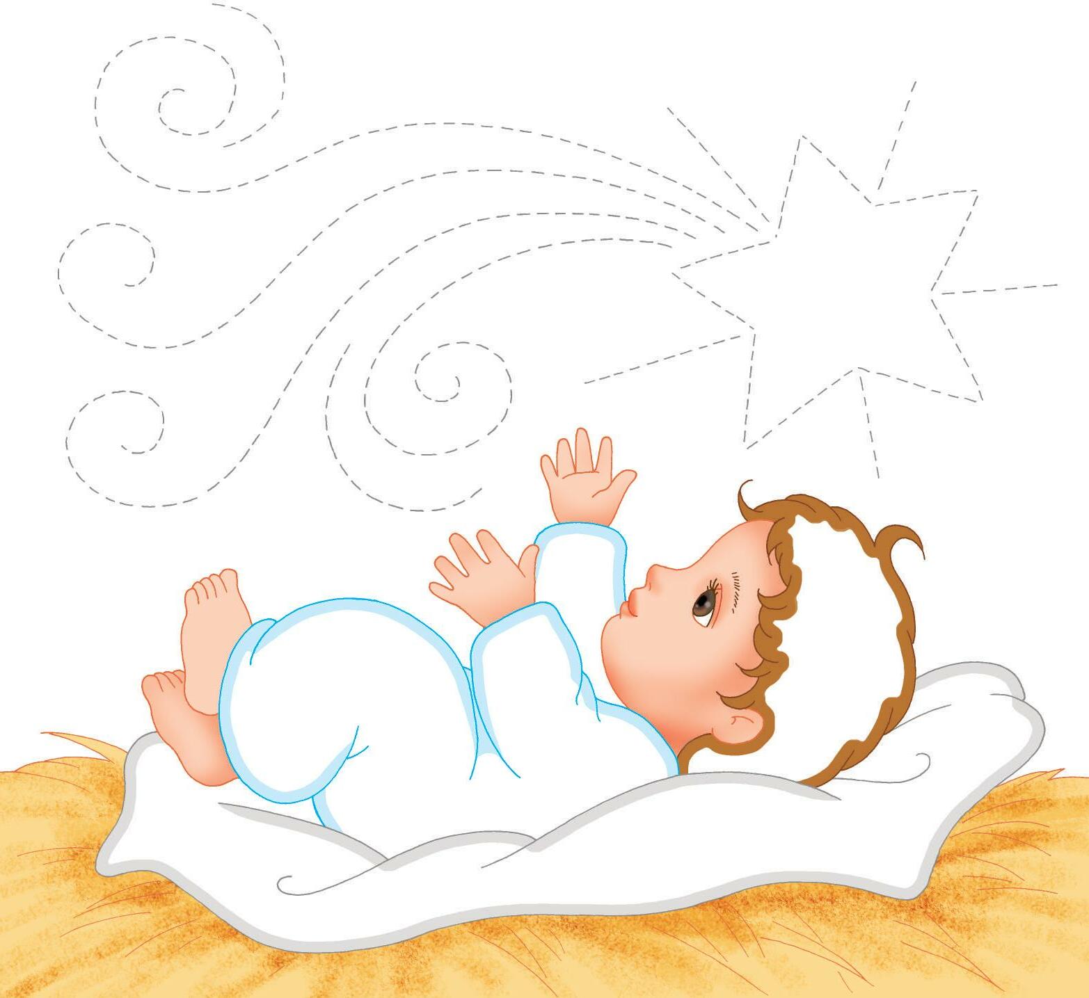 Ripassa i tratteggi, colora e incolla dei glitter dorati sulla scena. Che cosa si festeggia a Natale? Ascolta di quando sei nato tu. Valorizzare l’episodio centrale del Natale. Sviluppare la capacità visuo-motoria.