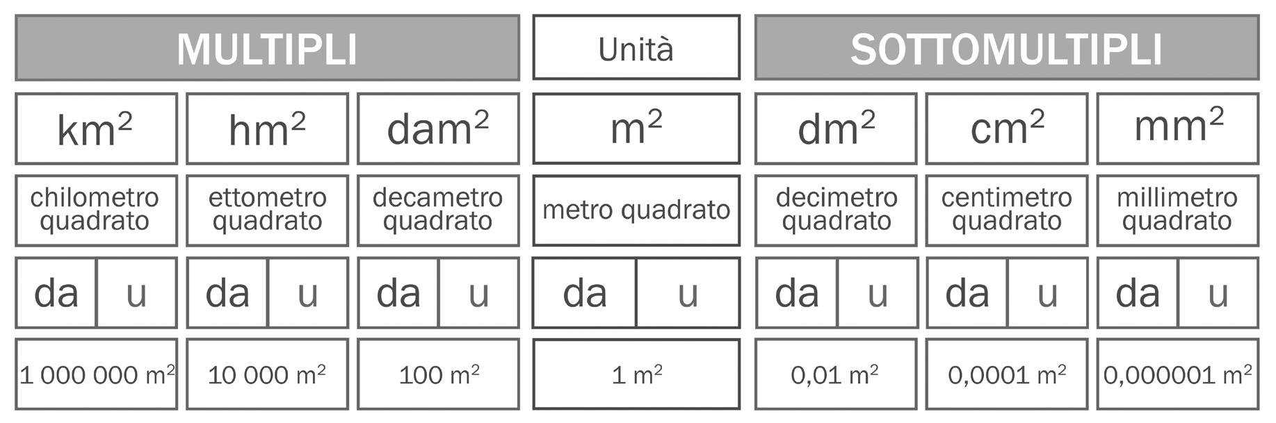 L’area è la misura della superficie racchiusa dal perimetro. L’unità di misura fondamentale della superficie è il metro quadrato (m²), cioè un quadrato con il lato di 1 m.