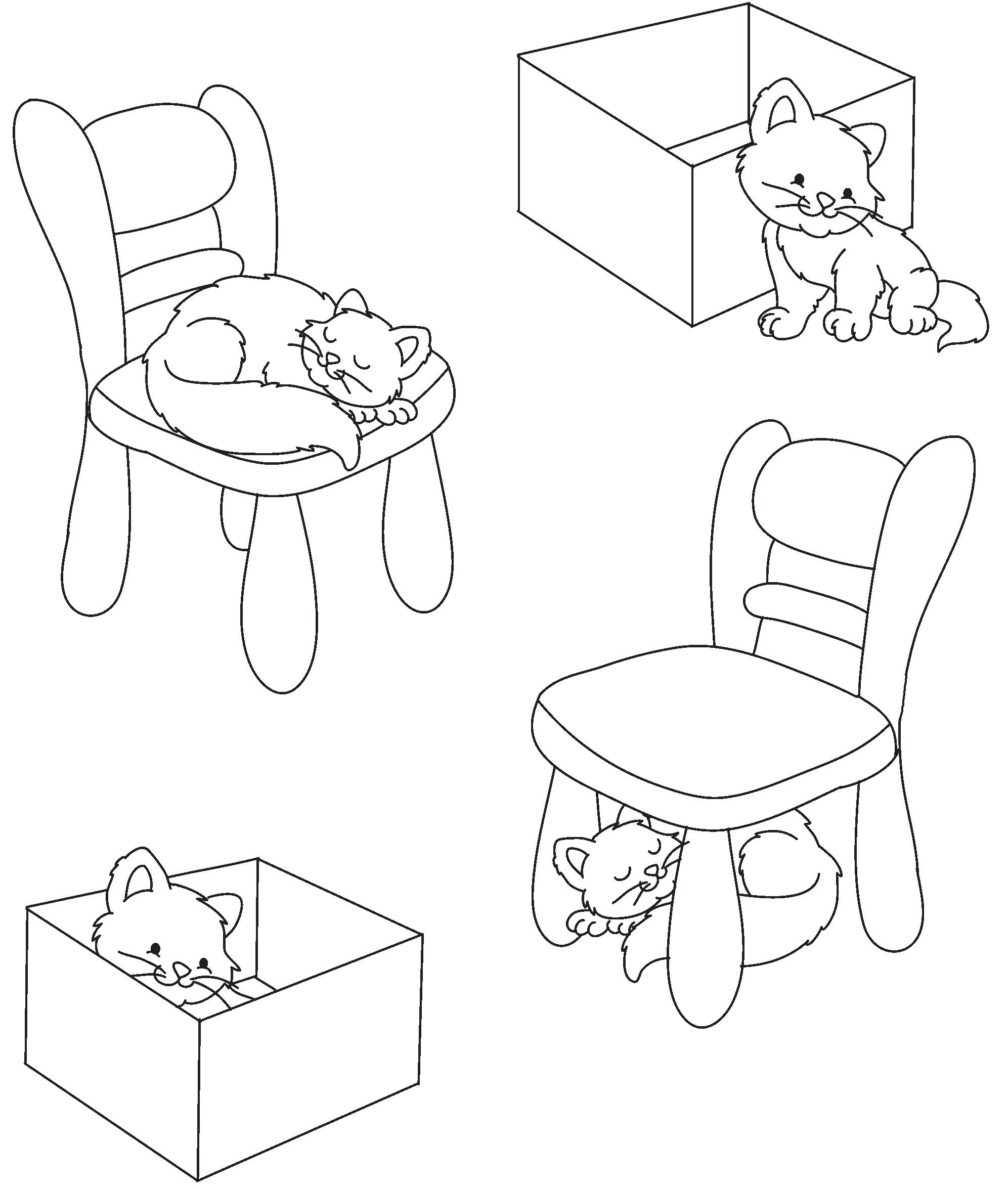 INDICA IL GATTINO CHE STA: SOPRA LA SEDIA, SOTTO LA SEDIA, FUORI DALLA SCATOLA, DENTRO LA SCATOLA.
