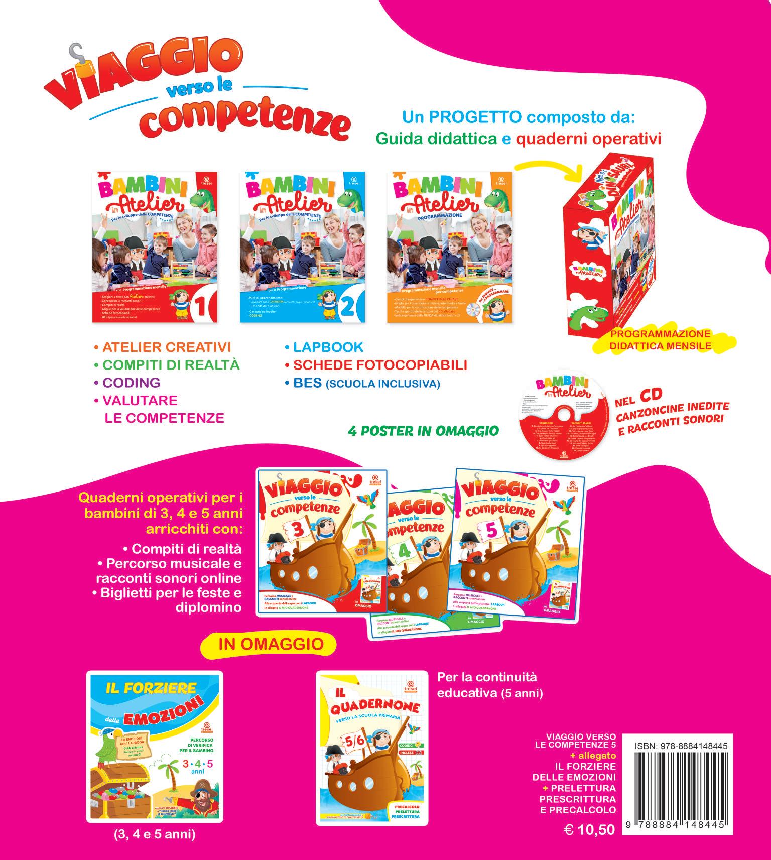 Viaggio verso le competenze” è la collana di quaderni operativi che propone ai bambini di 3-4-5 anni un viaggio emozionante, in compagnia di avventurosi pirati, per scoprire interessanti tematiche a partire dal contesto scolastico. I bambini sono come un equipaggio, uniti da un legame molto forte che li aiuta a superare ogni tempesta e a collaborare fianco a fianco, spingendoli alla ricerca di nuove avventure. Le schede degli album sono pensate per far acquisire agli alunni le competenze necessarie per la loro crescita personale. Particolare risalto viene dato ai quattro elementi (acqua, aria, terra, fuoco) e alla loro importanza per la vita di tutti.