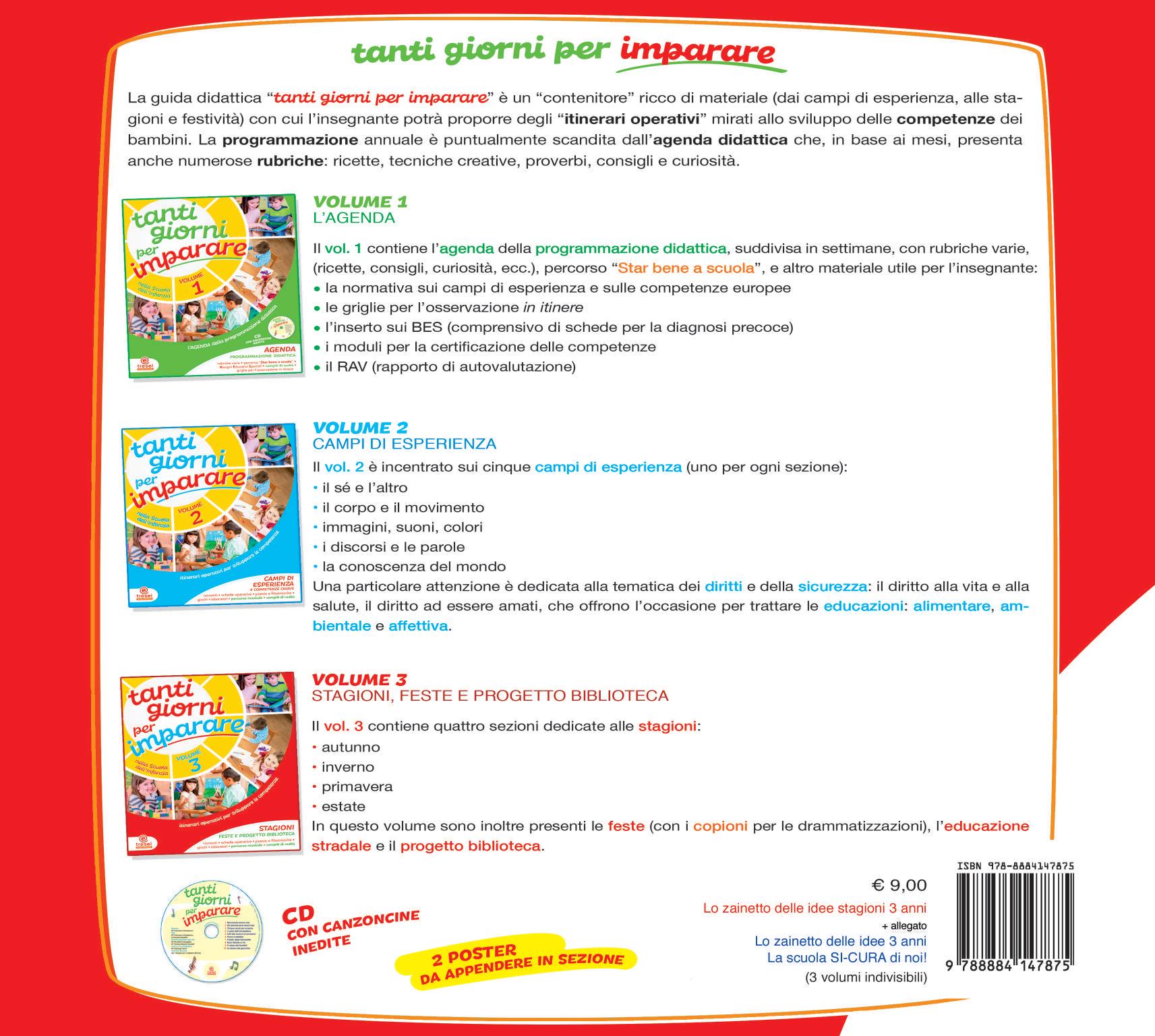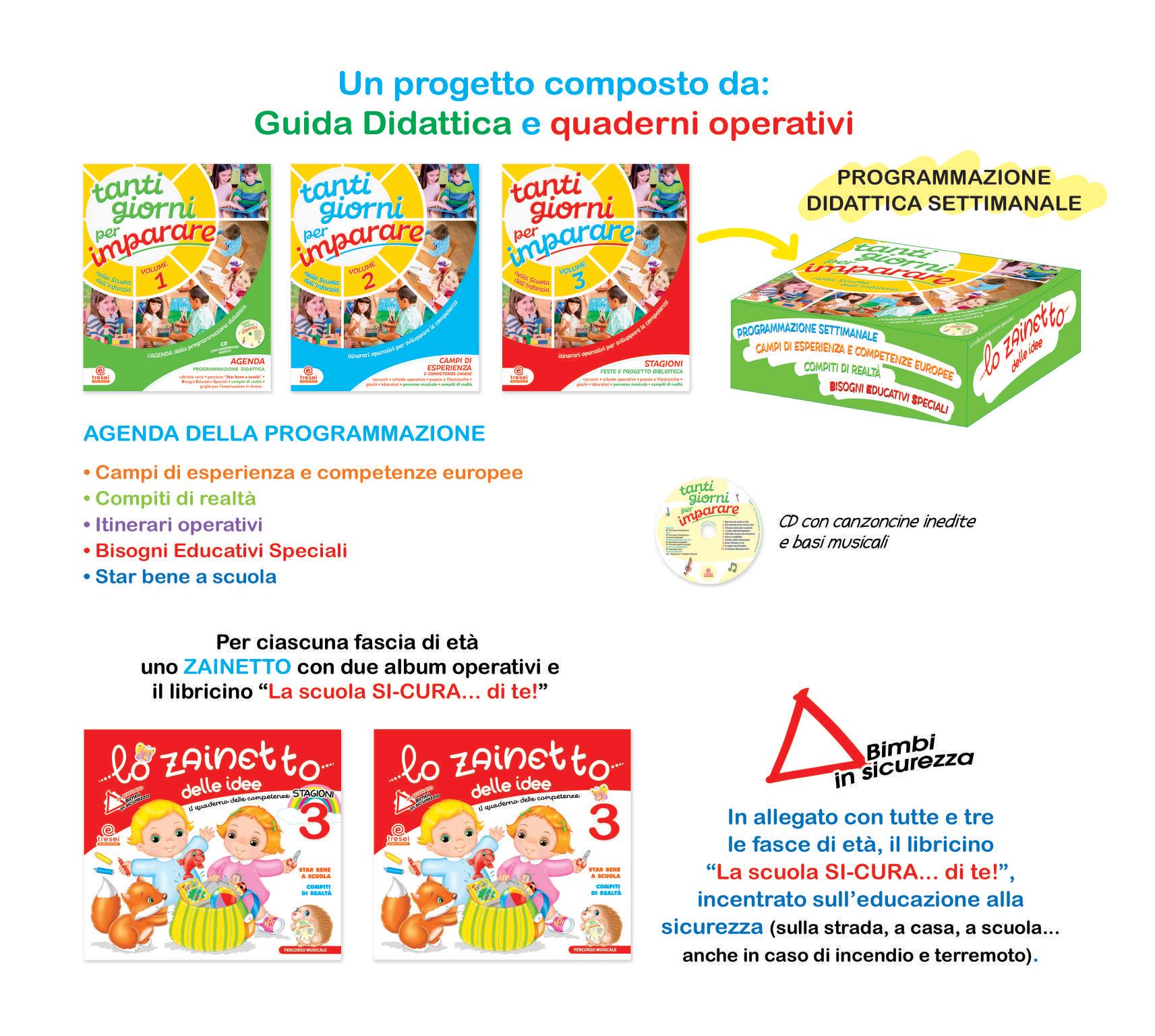 Le schede operative, strettamente correlate alla guida didattica “Tanti giorni per imparare”, sono strutturate sulla base dei cinque campi di esperienza previsti dalle “Indicazioni nazionali per il curricolo” e aiutano il bambino ad acquisire le competenze chiave europee, indispensabili per la propria crescita personale e per mettere alla prova le conoscenze e le abilità acquisite.